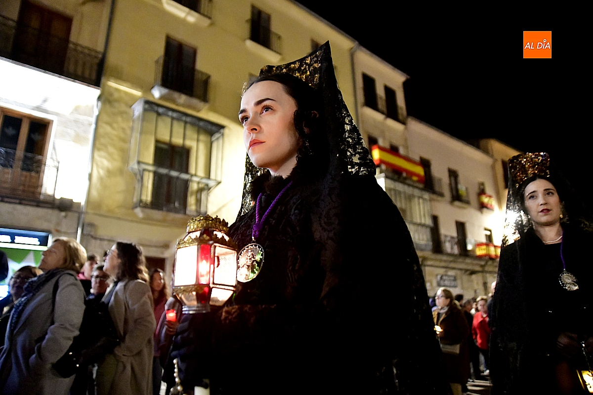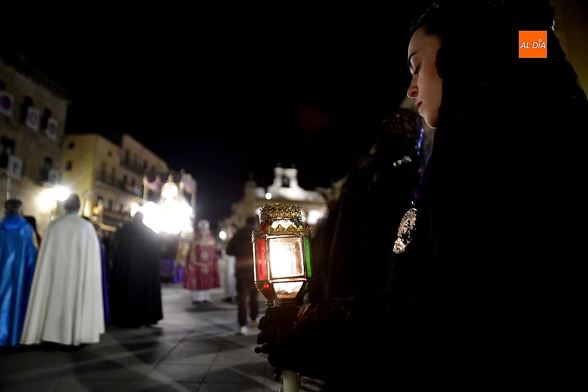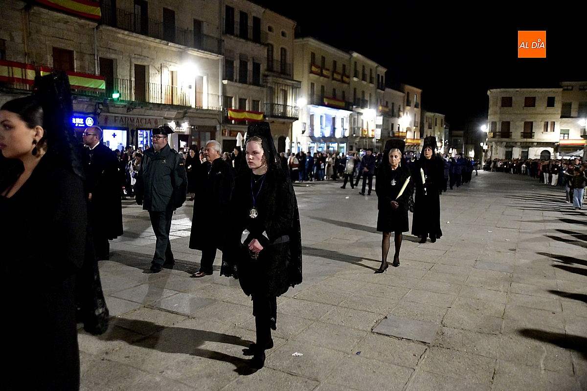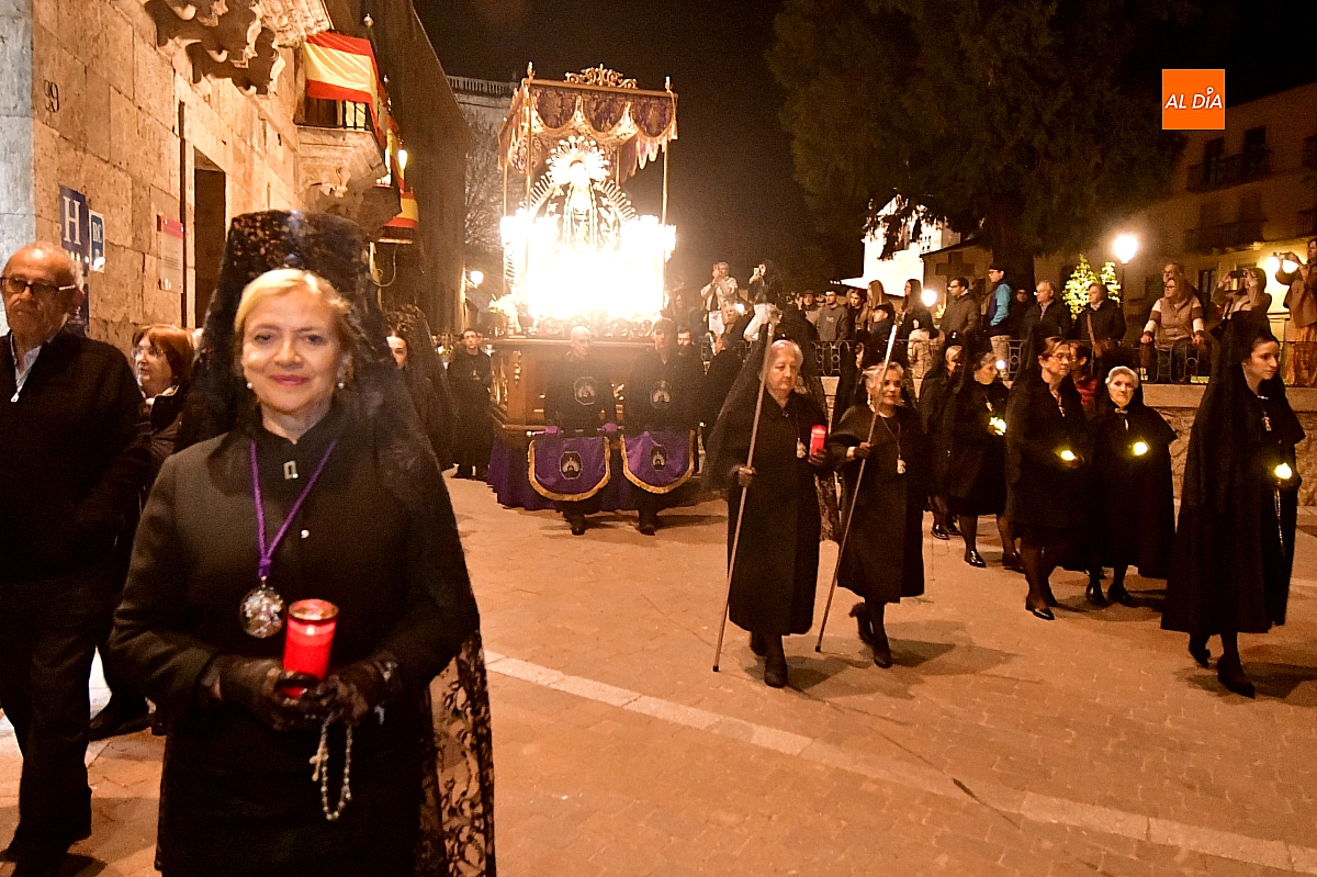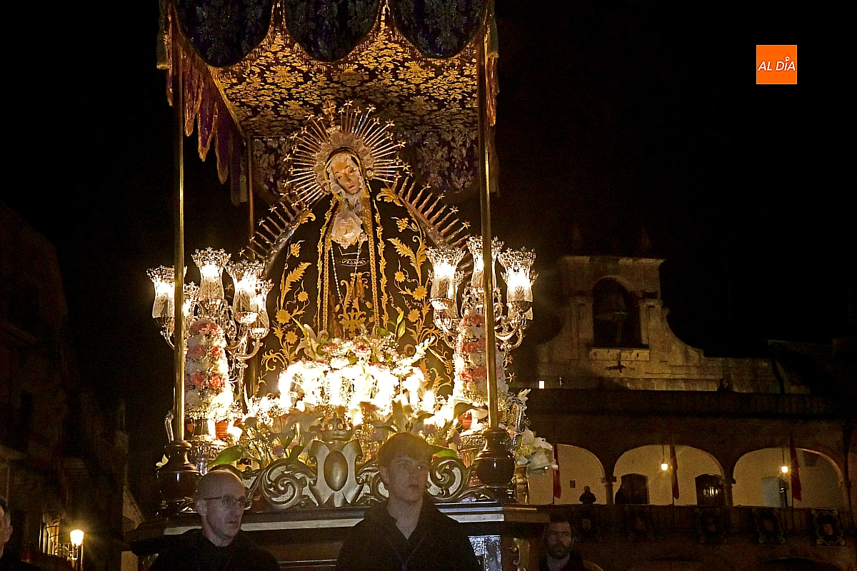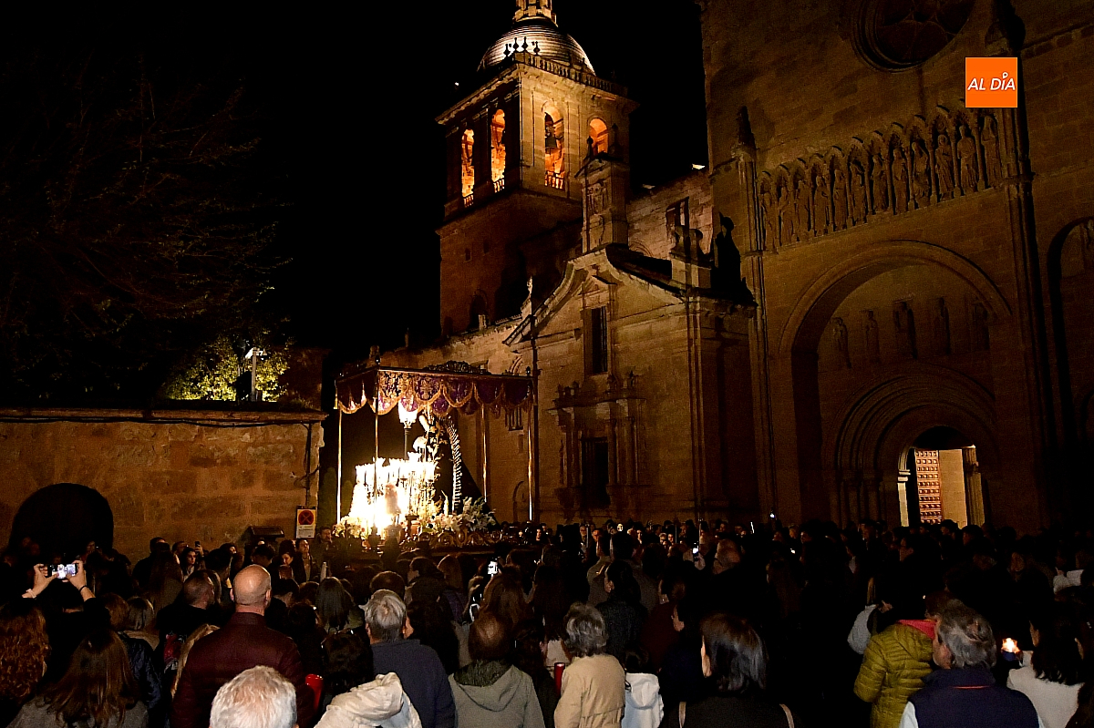 La noche, templada y serena, volvió a reunir a fieles de todas las edades en torno a la Virgen de la Soledad, en una de las estampas más íntimas y concurridas de la Semana Santa mirobrigense.
