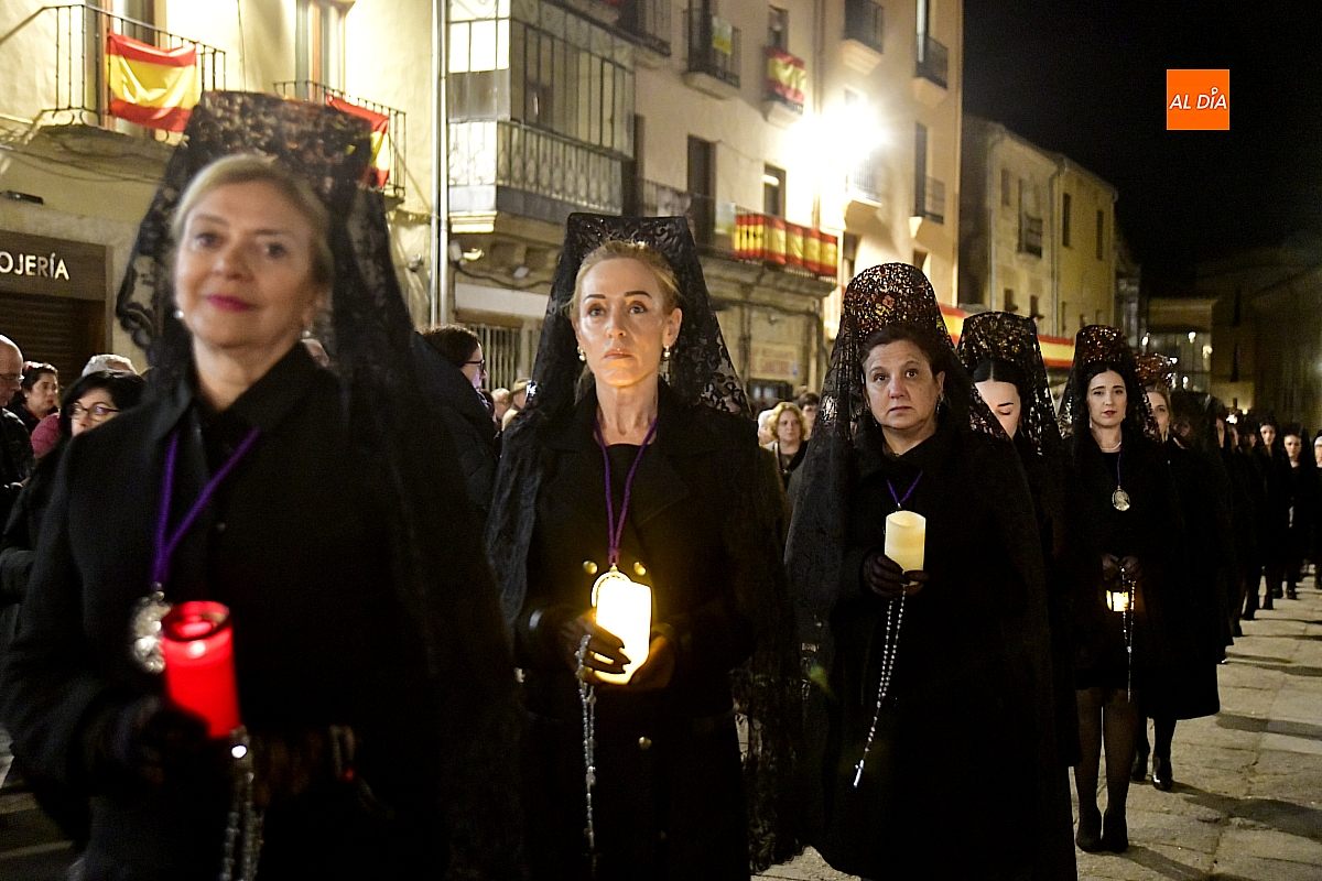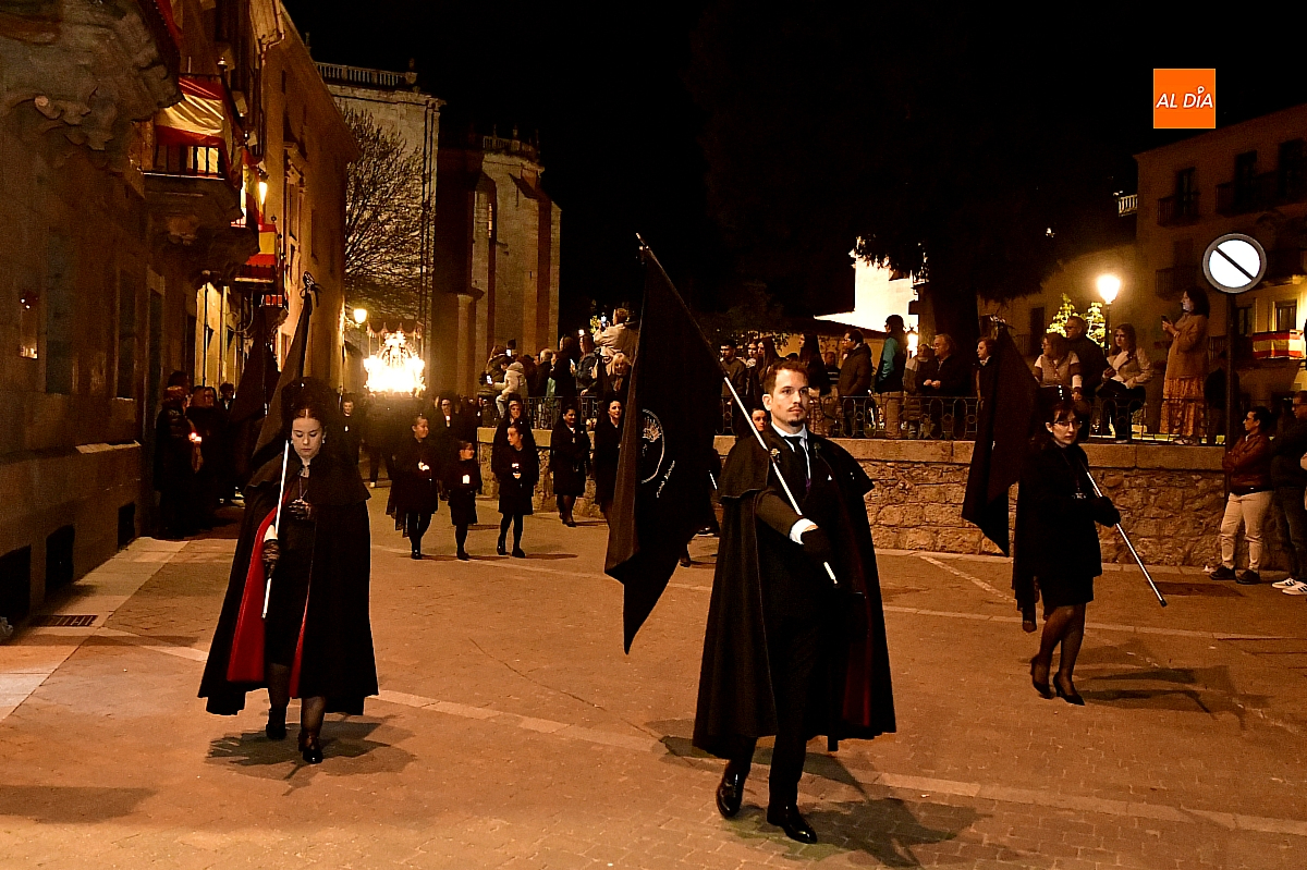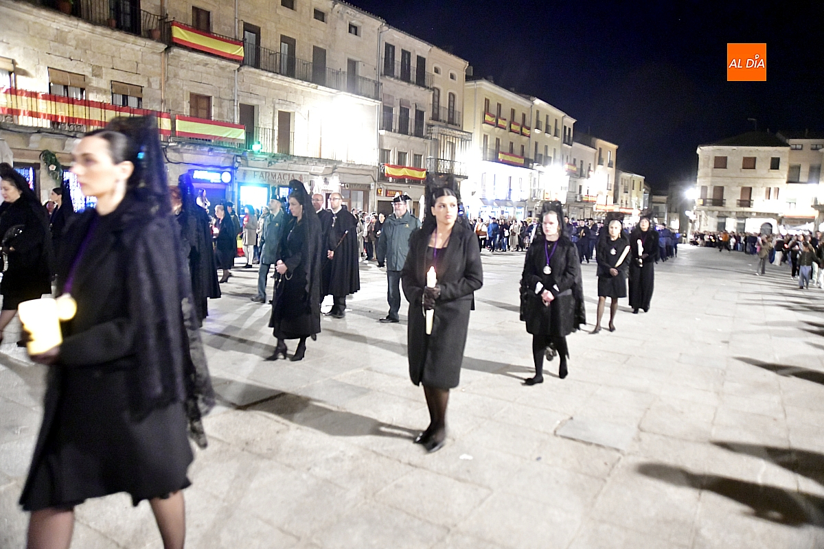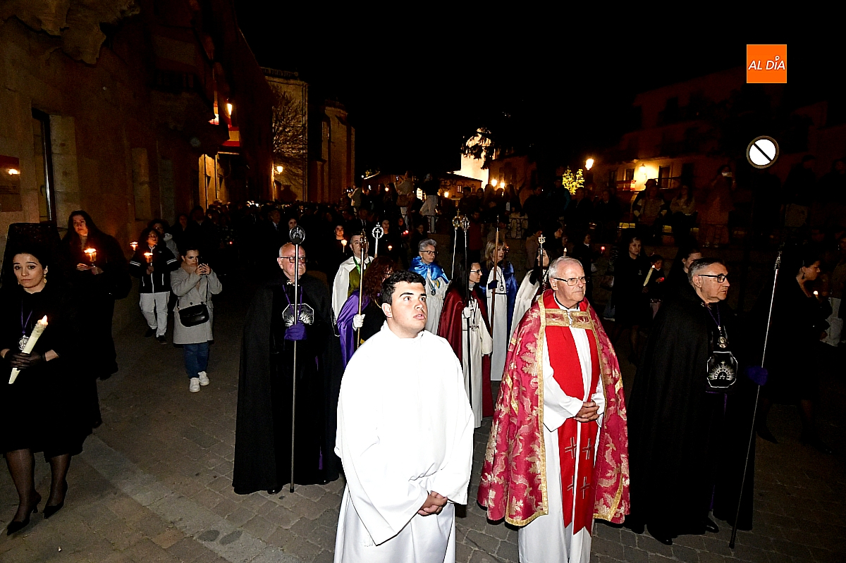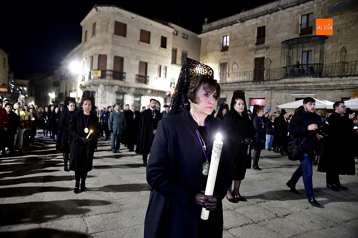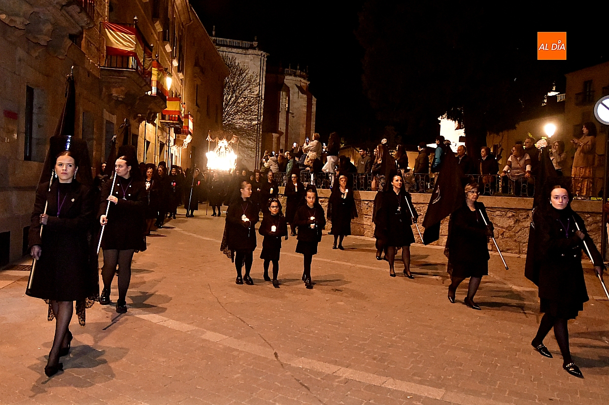 La noche, templada y serena, volvió a reunir a fieles de todas las edades en torno a la Virgen de la Soledad, en una de las estampas más íntimas y concurridas de la Semana Santa mirobrigense.