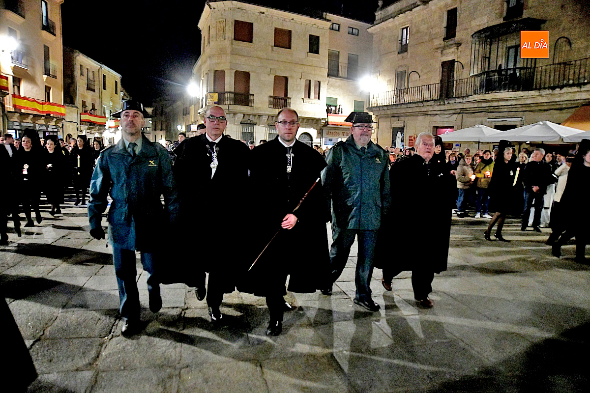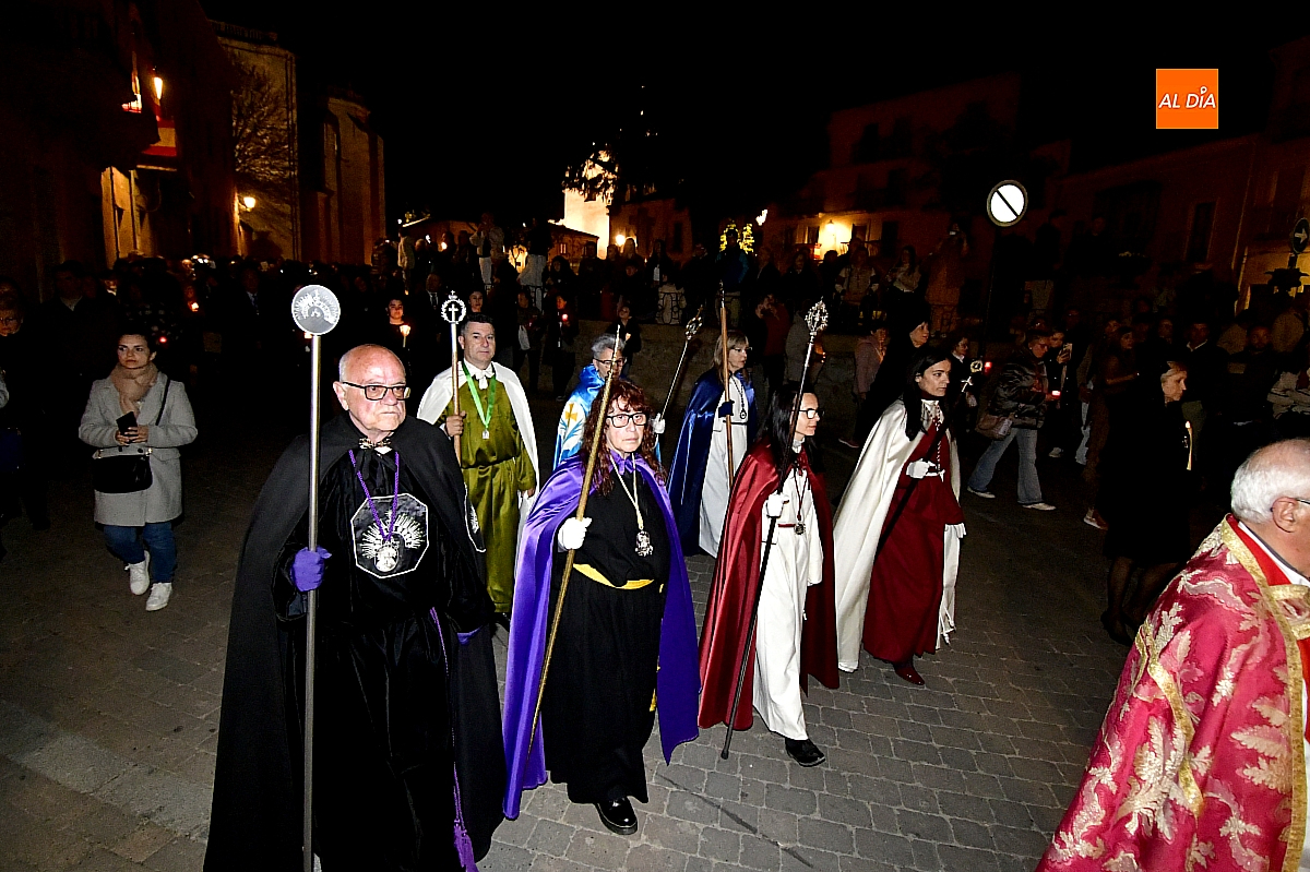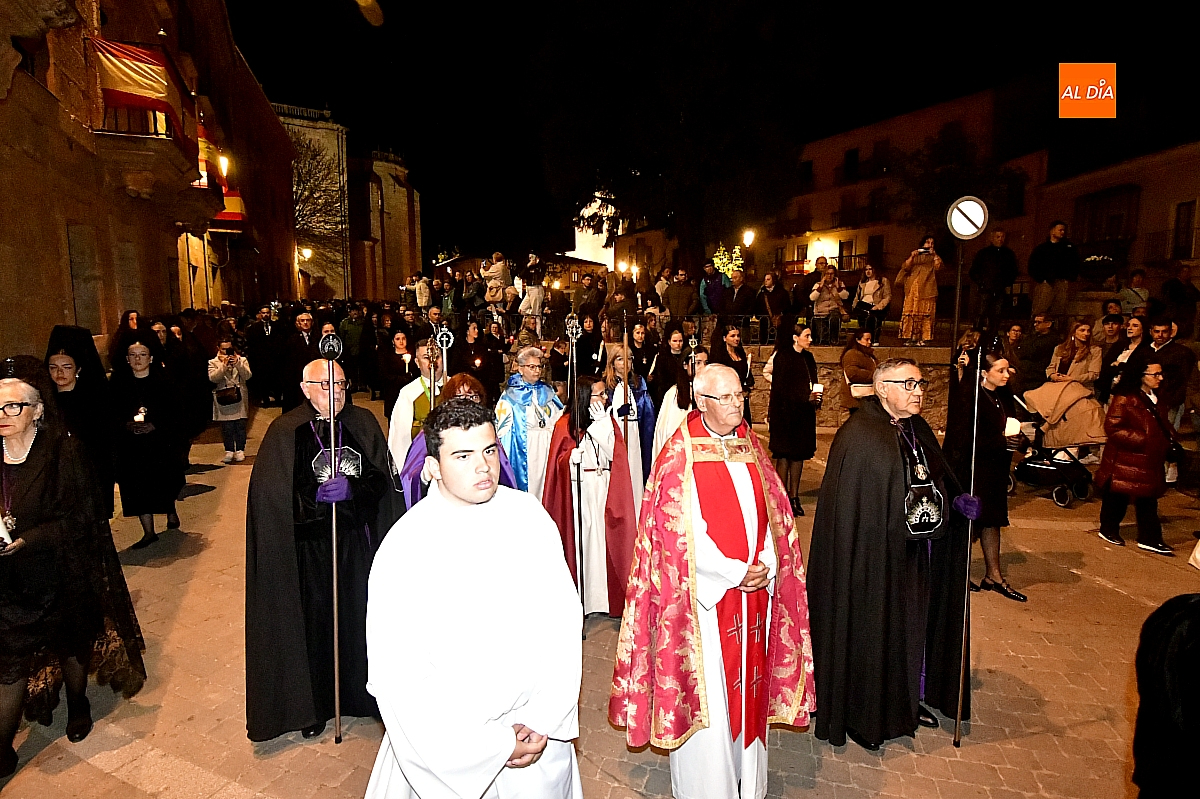 Tras la Virgen desfilaban el capellán de la cofradía, Ángel Martín Carballo, junto a su presidente, Tomás Domínguez Cid, acompañados por un monaguillo. Les seguían representantes del resto de hermandades de la Semana Santa mirobrigense, así como la Corporación Municipal vestidas las concejalas con mantilla, encabezada por el Alcalde Marcos Iglesias con su bastón de mando, junto al Capitán de la Guardia Civil en Ciudad Rodrigo, Pablo Javier Ruiz Gatell de Gordejuela,. Cerraba la comitiva la Banda Municipal de Música.