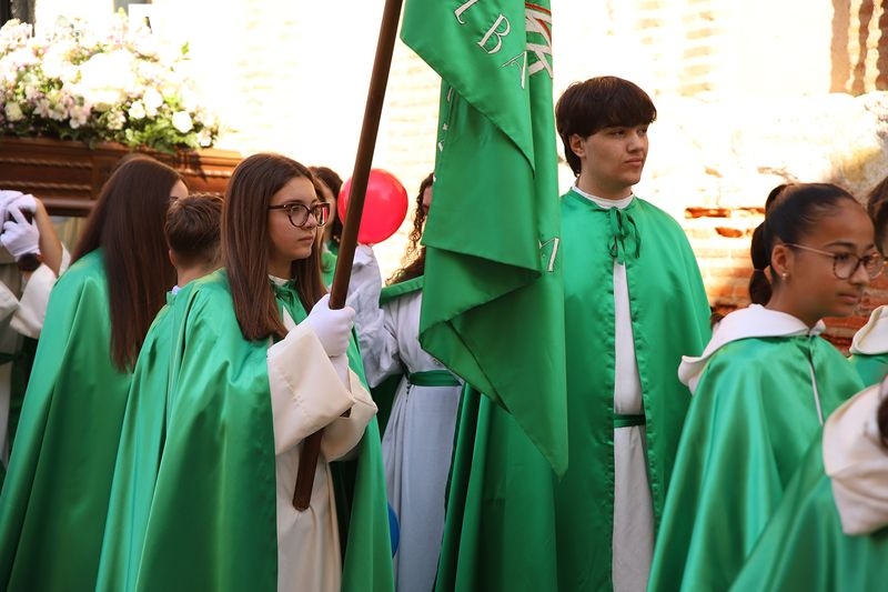 El acto central de la mañana fue el emotivo Encuentro del Resucitado con María. En este instante, la Virgen de la Alegría abandonó el luto para irradiar júbilo ante los vecinos congregados. Este año, la imagen ha lucido de manera especial al estrenar un manto de brocado granadino, una pieza única que ha sido posible gracias a la donación de varios fieles .