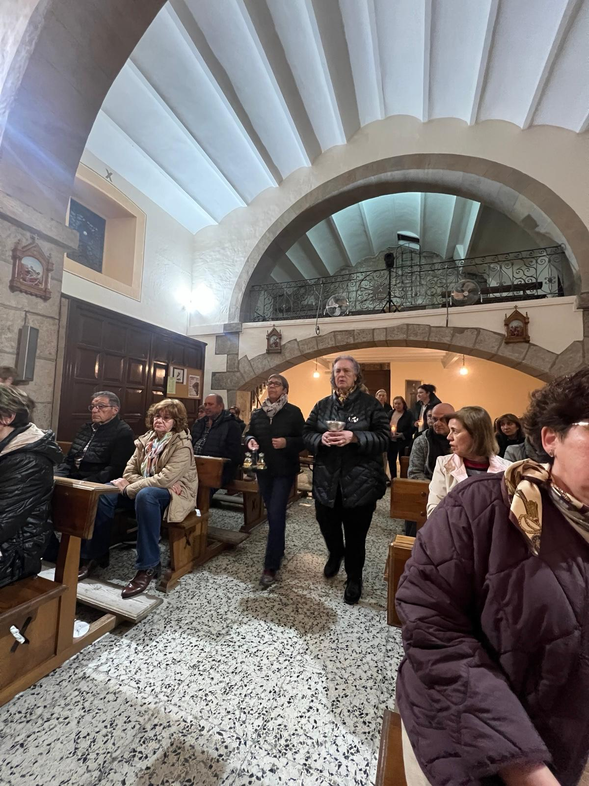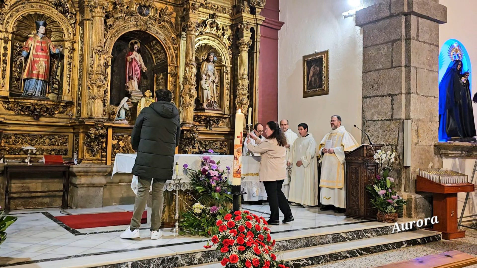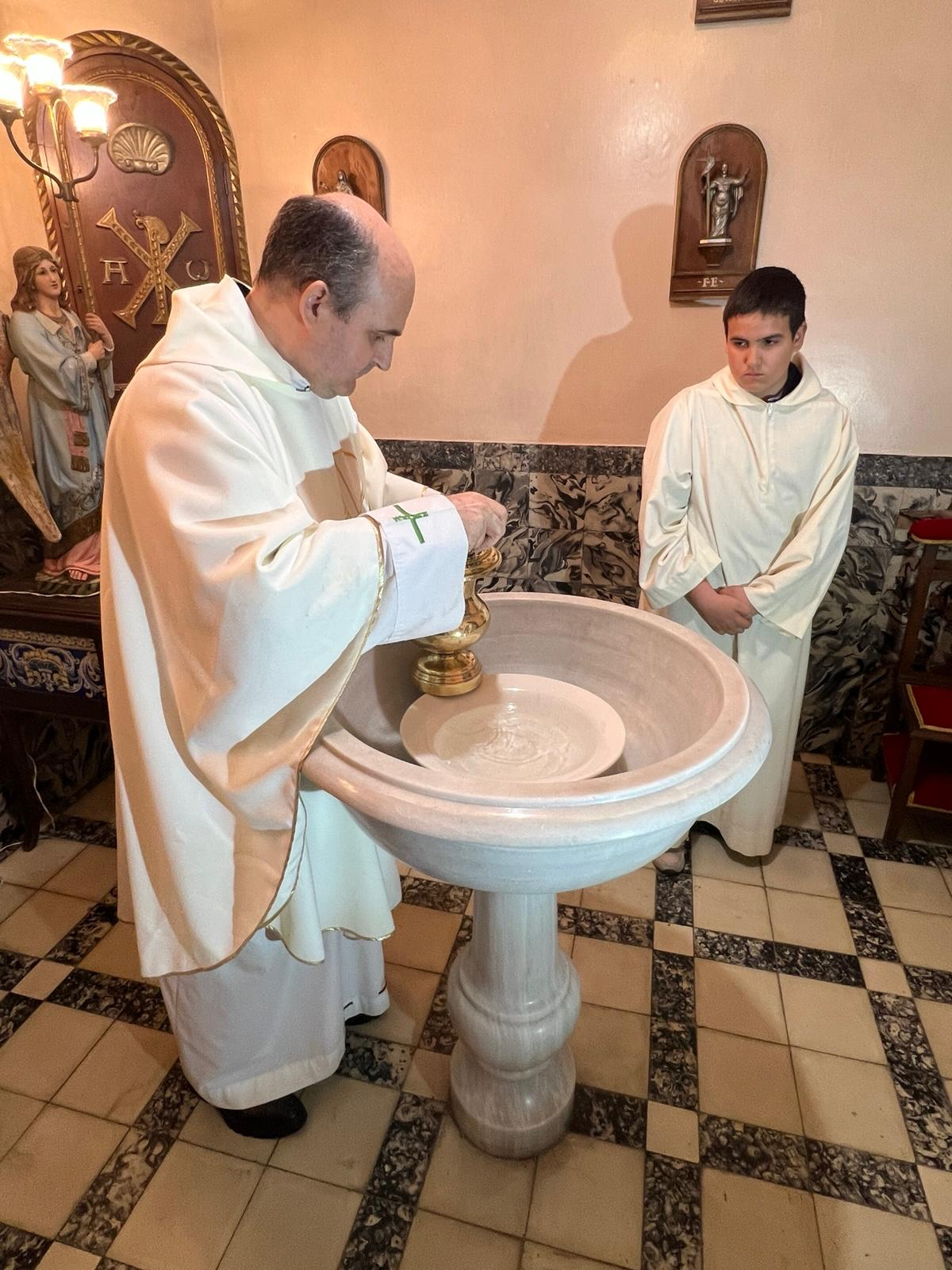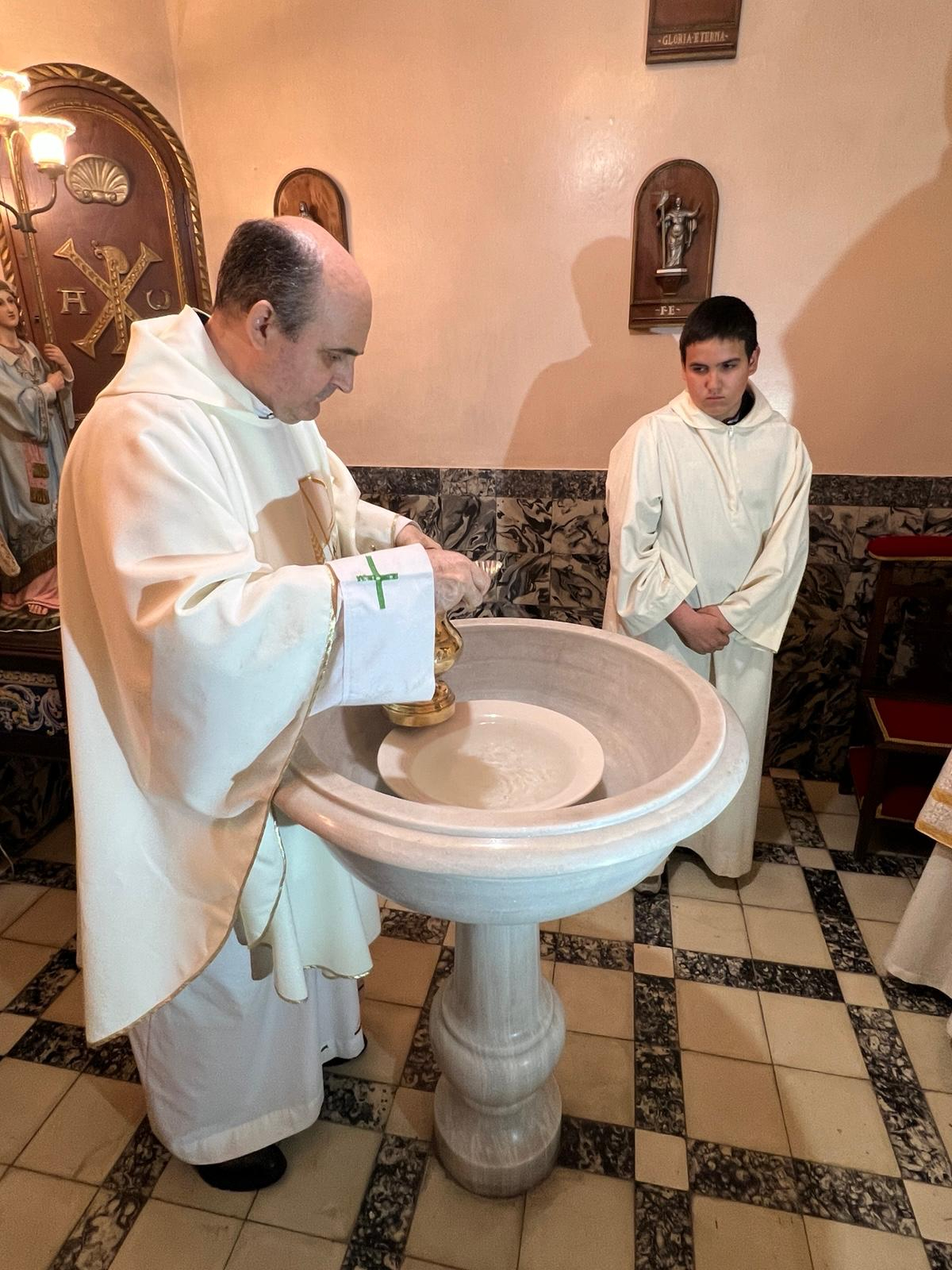 Tras la liturgia de la palabra, la celebración continuó con la bendición del agua bendita. Este año, el rito se ha llevado a cabo en el baptisterio de la parroquia, un espacio que destaca por su valor tradicional y arquitectónico dentro del recinto religioso.