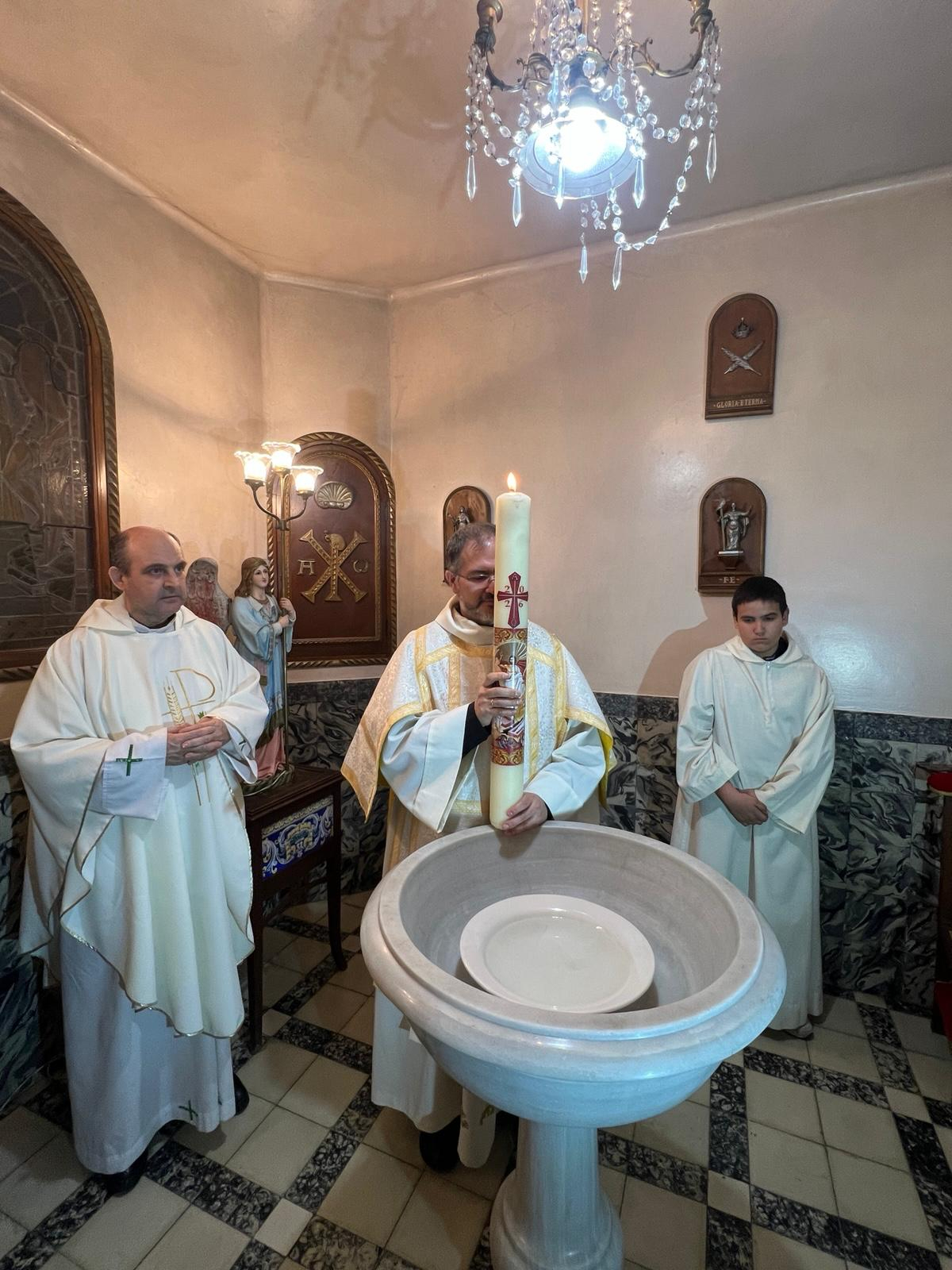 Posteriormente, la liturgia se trasladó al atrio de la iglesia, donde tuvo lugar uno de los momentos más significativos de la noche: la bendición del fuego y el encendido del Cirio Pascual. A continuación, se desarrolló la procesión con el cirio a través de las naves del templo en completa oscuridad, seguida de la lectura de las Sagradas Escrituras.