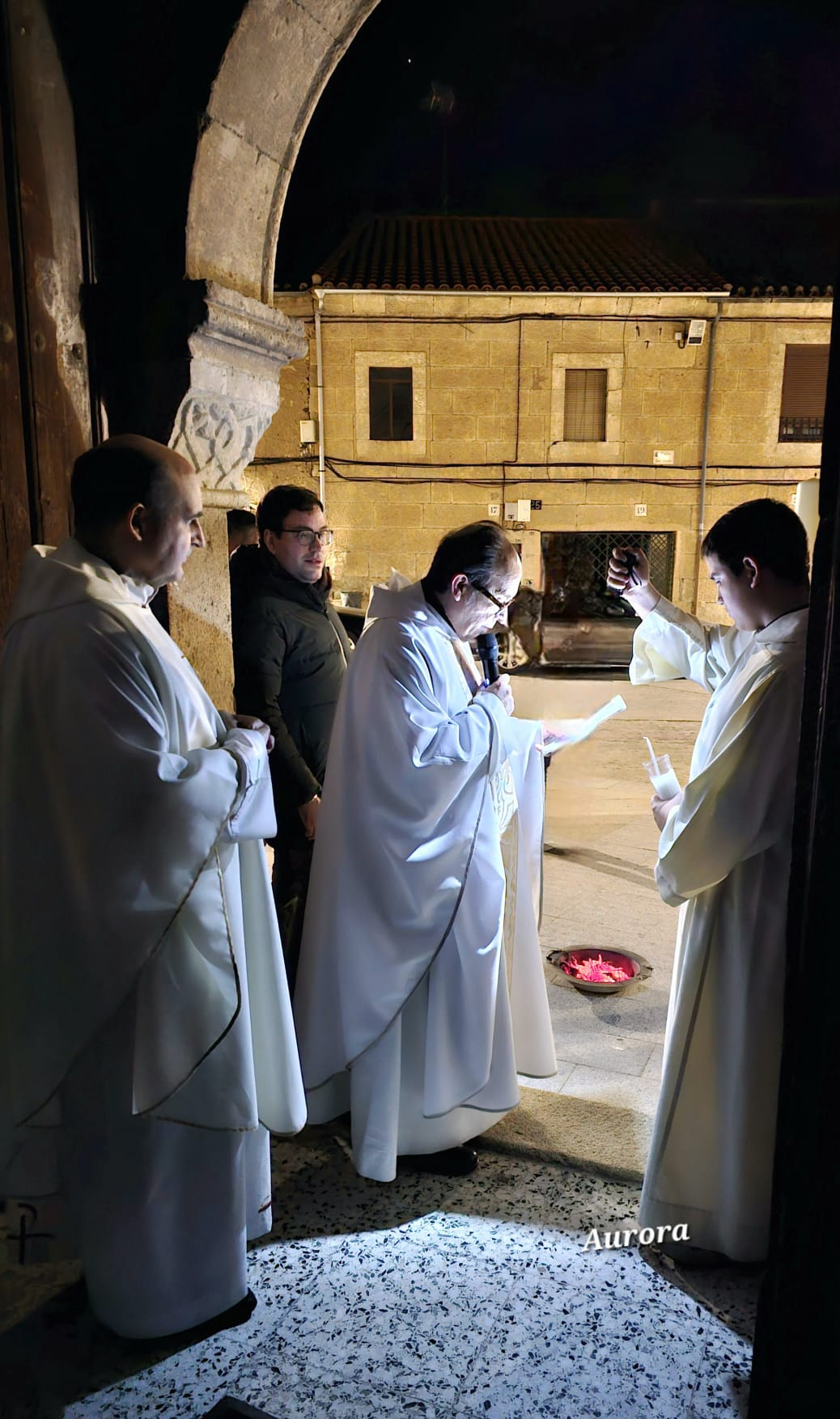 La ceremonia estuvo presidida por el párroco titular, Tomás Muñoz Porras, quien contó con el acompañamiento del sacerdote Víctor Sevillano y del diácono Daniel Mielgo. El inicio de la vigilia estuvo marcado por el característico sonido de las carracas de la parroquia, un elemento tradicional que anuncia el luto previo a la resurrección.