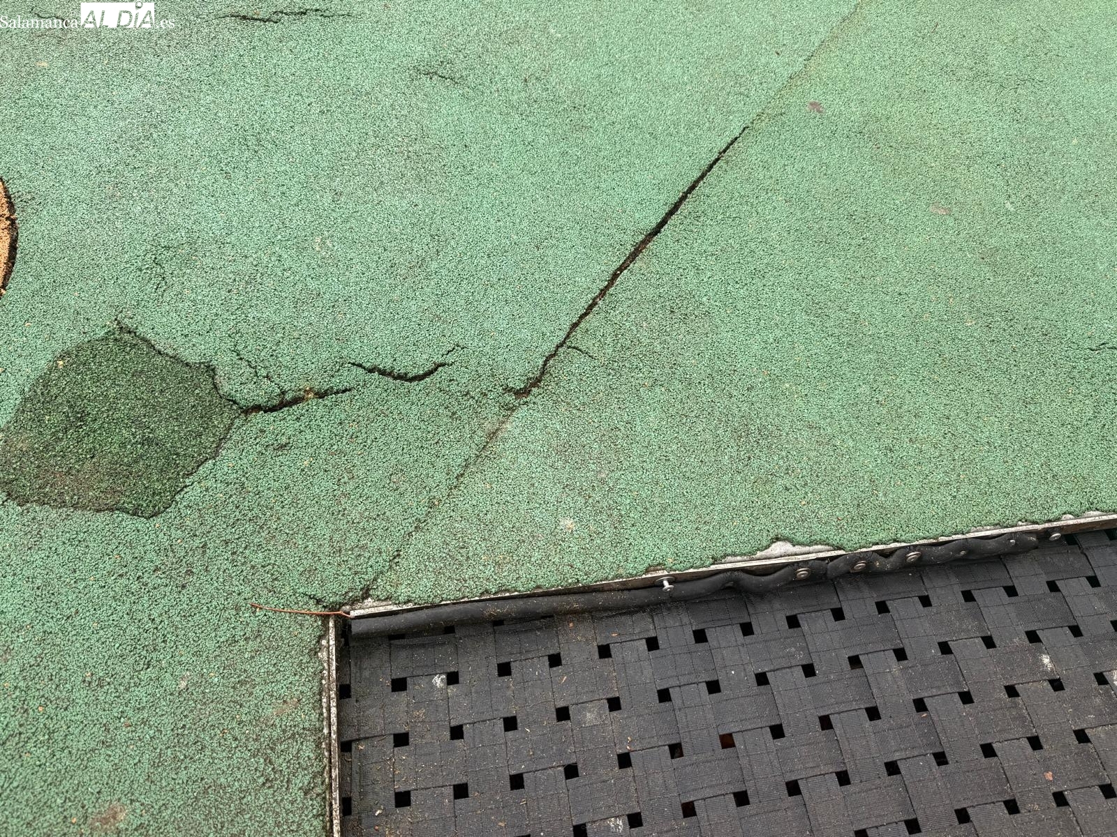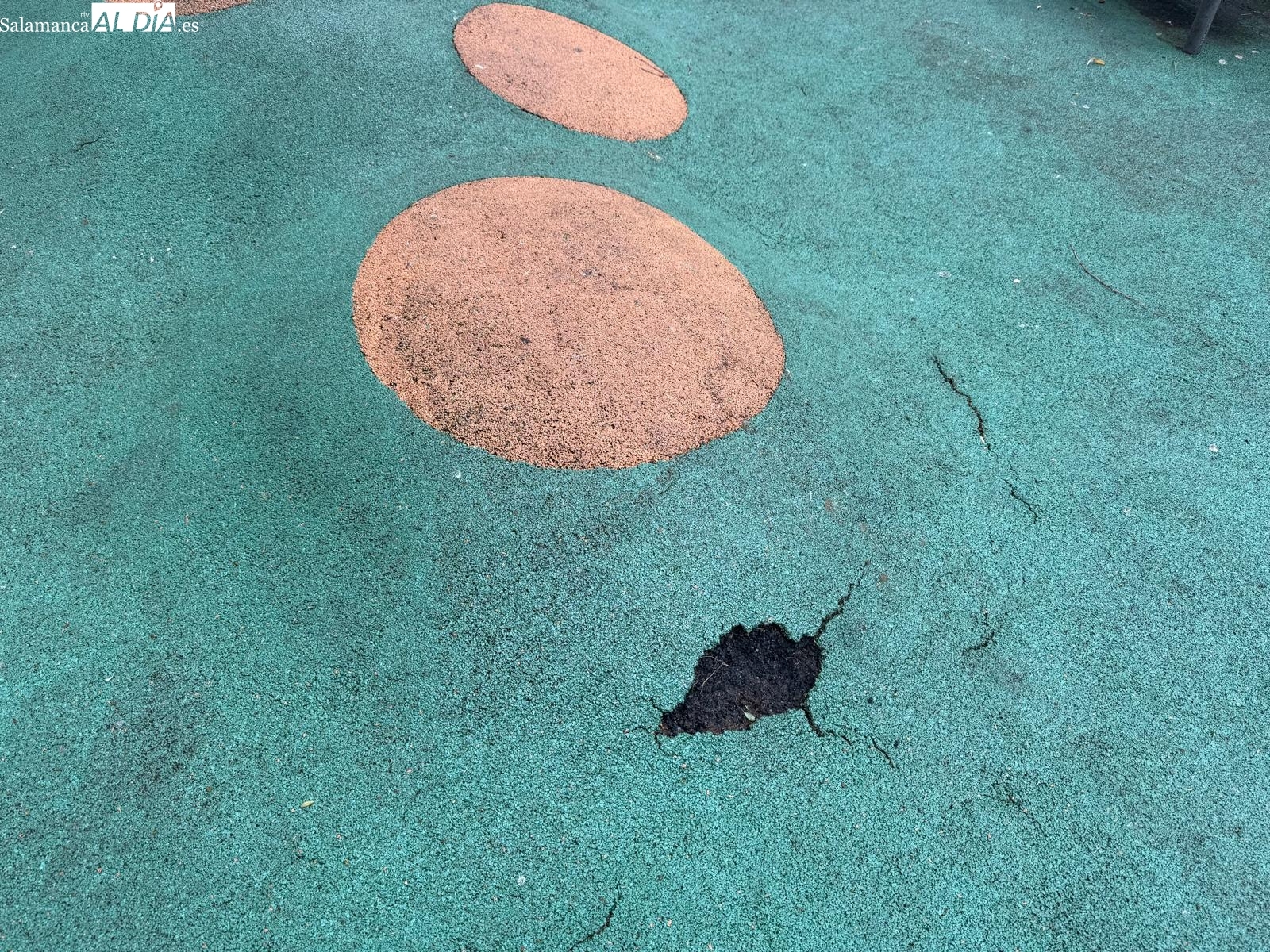 Las fotografías aportadas por los vecinos documentan varios puntos críticos dentro del área de juegos que requieren atención. Los desperfectos afectan tanto a la superficie de seguridad como a las propias atracciones infantiles.