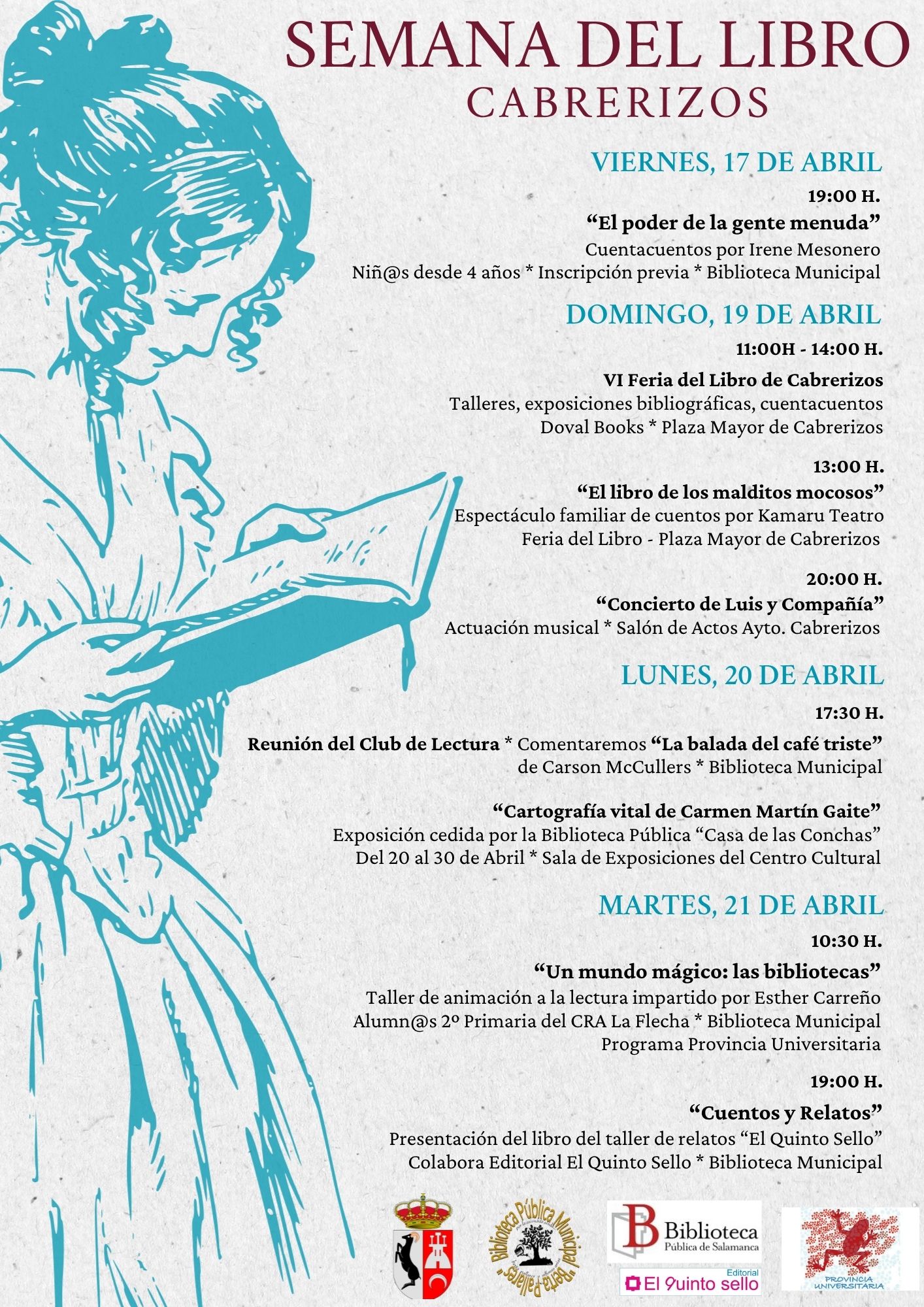 Cabrerizos se prepara para acoger su VI Feria del Libro, el evento central de una completa Semana del Libro que se desarrollará desde el 17 hasta el 21 de abril. La iniciativa, impulsada por la Biblioteca Municipal "Berta Pallares", busca fomentar el hábito de la lectura a través de una variada programación para todos los públicos.