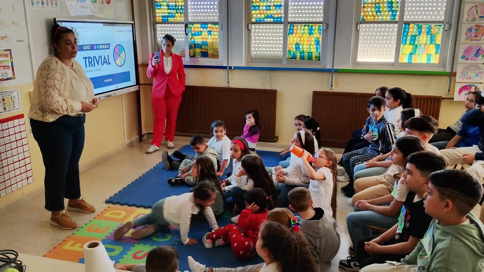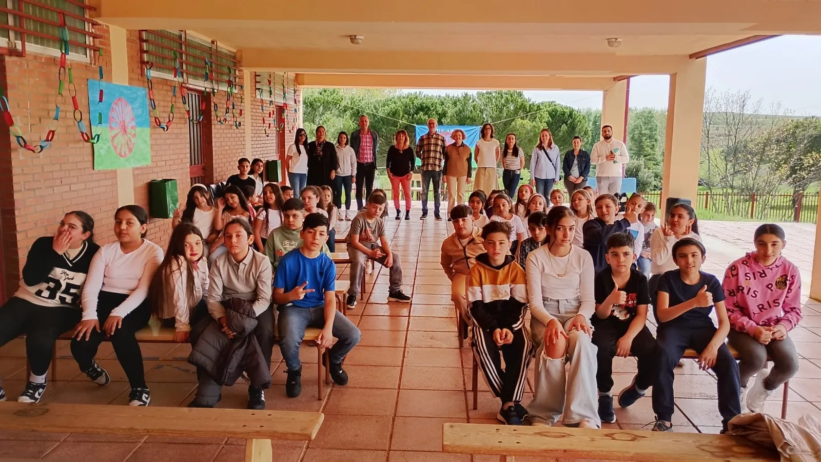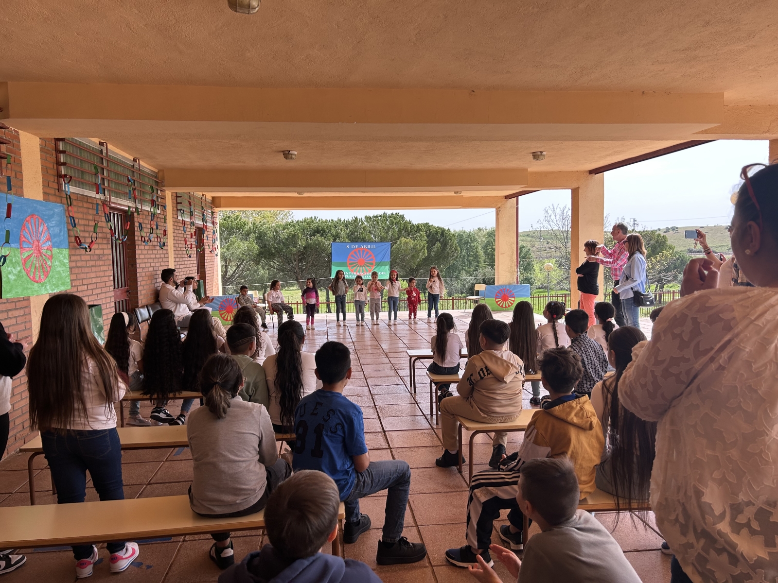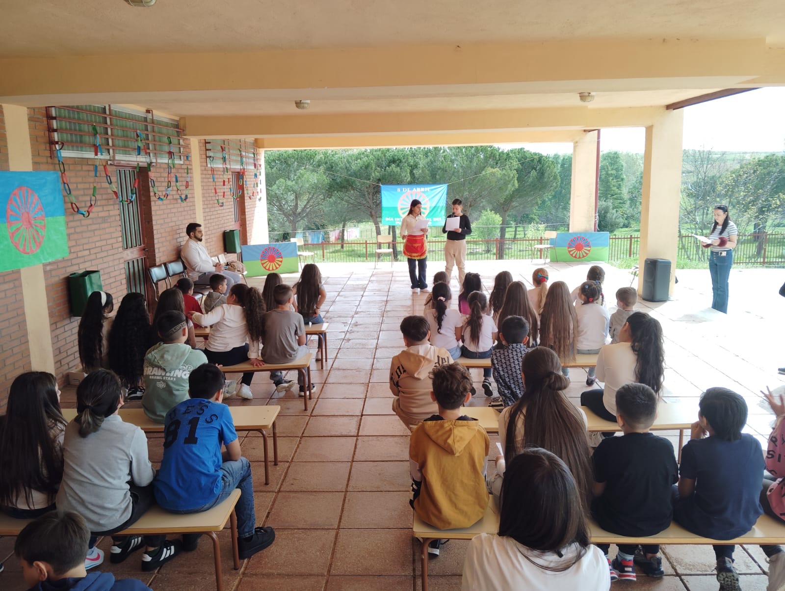Para finalizar los actos conmemorativos, los padres y familiares del alumnado han visitado las instalaciones del colegio, donde han podido disfrutar de la exposición preparada específicamente para esta celebración, en la que también ha lucido una pancarta conmemorativa con la bandera romaní.