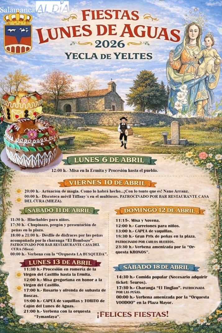 El Lunes de Aguas del 13 de abril centrará su atención en el fervor hacia la Virgen del Castillo, contando con Óscar Vicente y Eva Sánchez como mayordomos. Los actos principales arrancarán con la tradicional procesión en romería hasta la ermita, donde los fieles asistirán a una misa gregoriana en honor a la patrona, acompañados por la música tradicional de El Mariquelo y su grupo de charros.