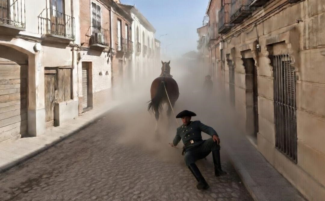 Sin embargo, no le debió parecer tan buena idea al caballo, que enloqueció y salió velozmente corriendo desbocado, arrastrando al teniente por las calles peñarandinas, en un trayecto de locura en que recorrió la calle de Nuestra Señora (a la que llegaría presumiblemente por la calle San José, aún sin desbocarse) y la calle del Carmen, para finalizar su trayecto en la calle Comadre (hoy denominada Isabel la Católica), donde el caballo tropezó con las piedras amontonadas de obras que se estaban realizando en el Teatro Calderón, cayendo el corcel al suelo, pudiendo ser controlado.