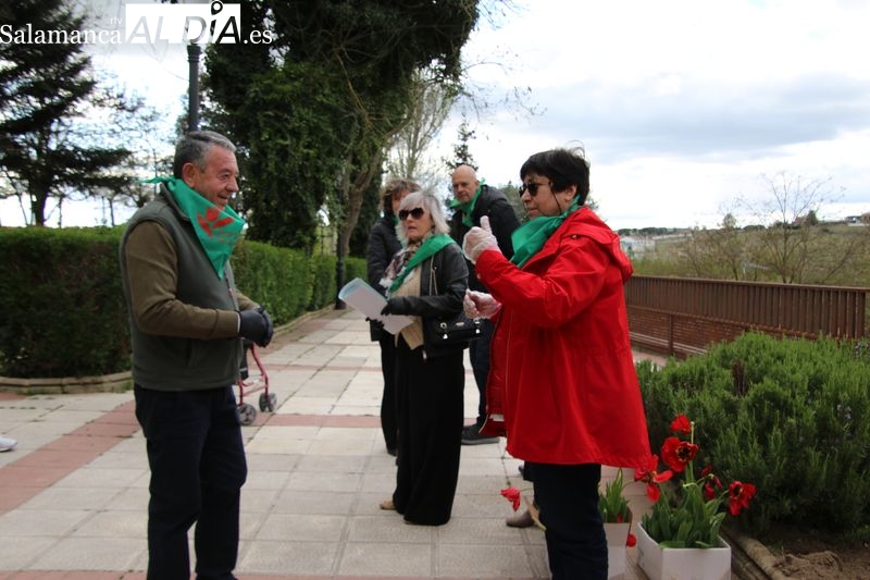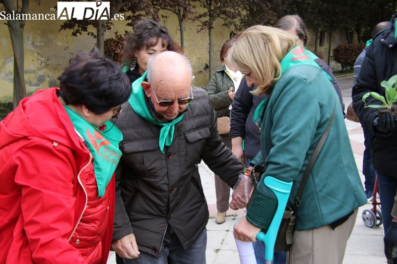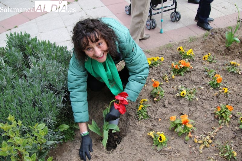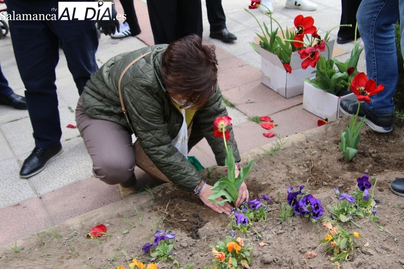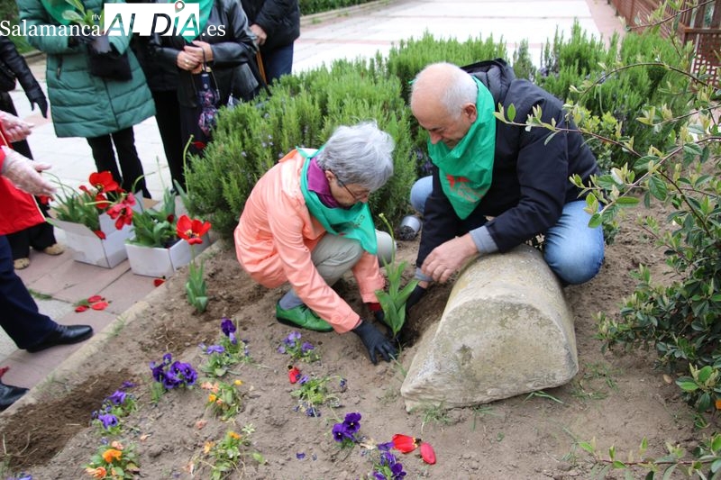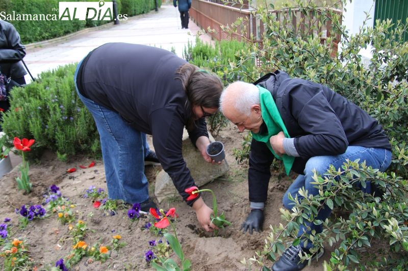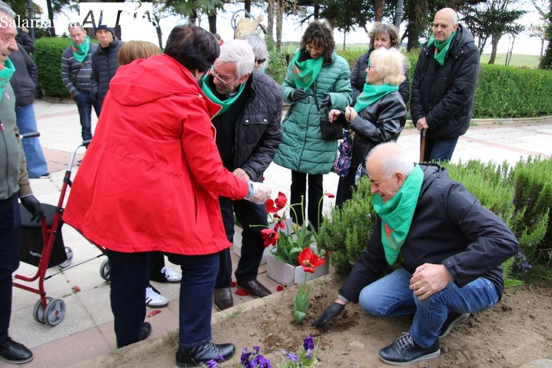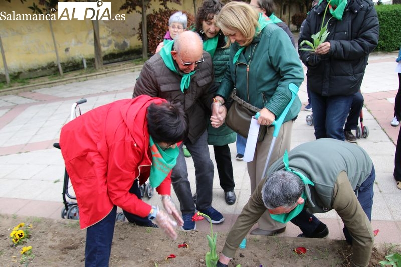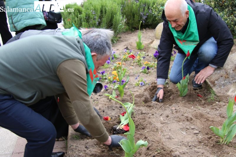 Alba de Tormes se ha sumado a la conmemoración del Día Mundial del Parkinson con la plantación de tulipanes en el parque El Espolón, un gesto simbólico en el que han participado principalmente socios de la Asociación Parkinson Salamanca.