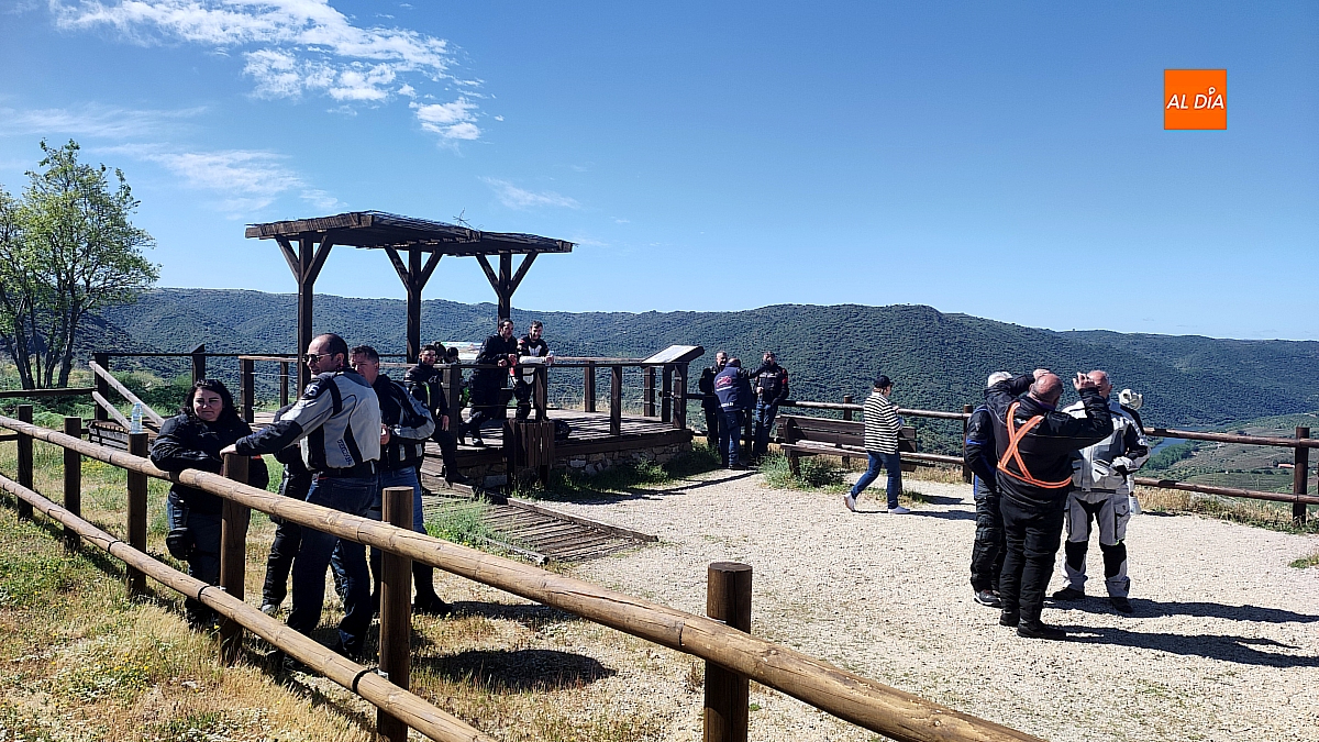 El río Duero, siempre presente, acompañó a los motoristas como una línea de continuidad geográfica y simbólica. Tras cruzarlo de nuevo por la presa de Saucelle, el grupo ascendió hacia su mirador, donde realizaron una parada ya en territorio español. Allí, con el paisaje abierto ante ellos, compartieron un breve descanso: un bocadillo y un refresco ofrecidos por la organización, en un ambiente donde la conversación y la contemplación se entrelazaban con naturalidad.