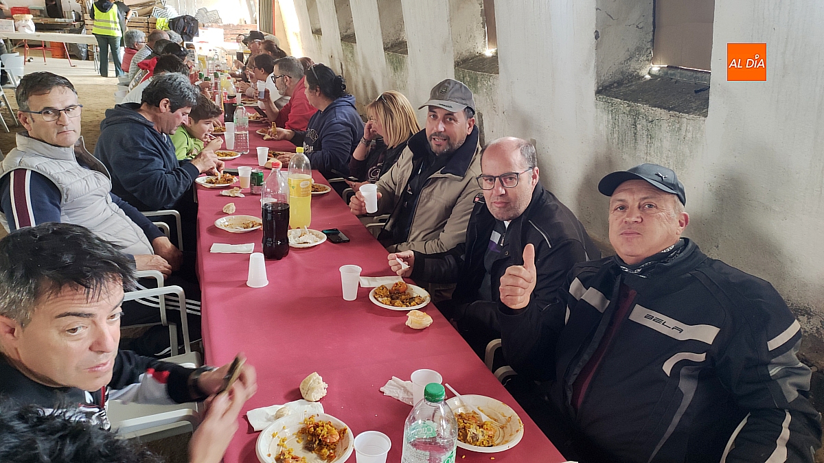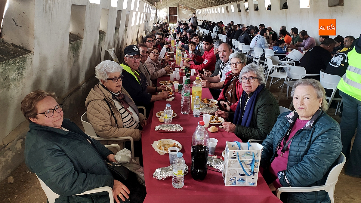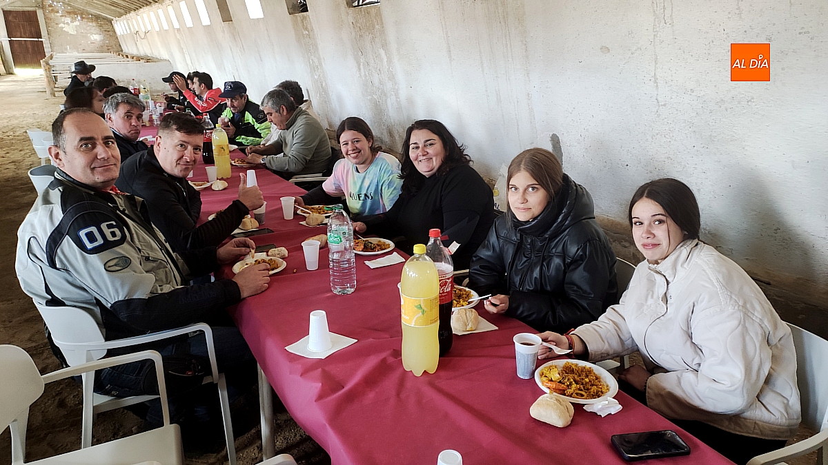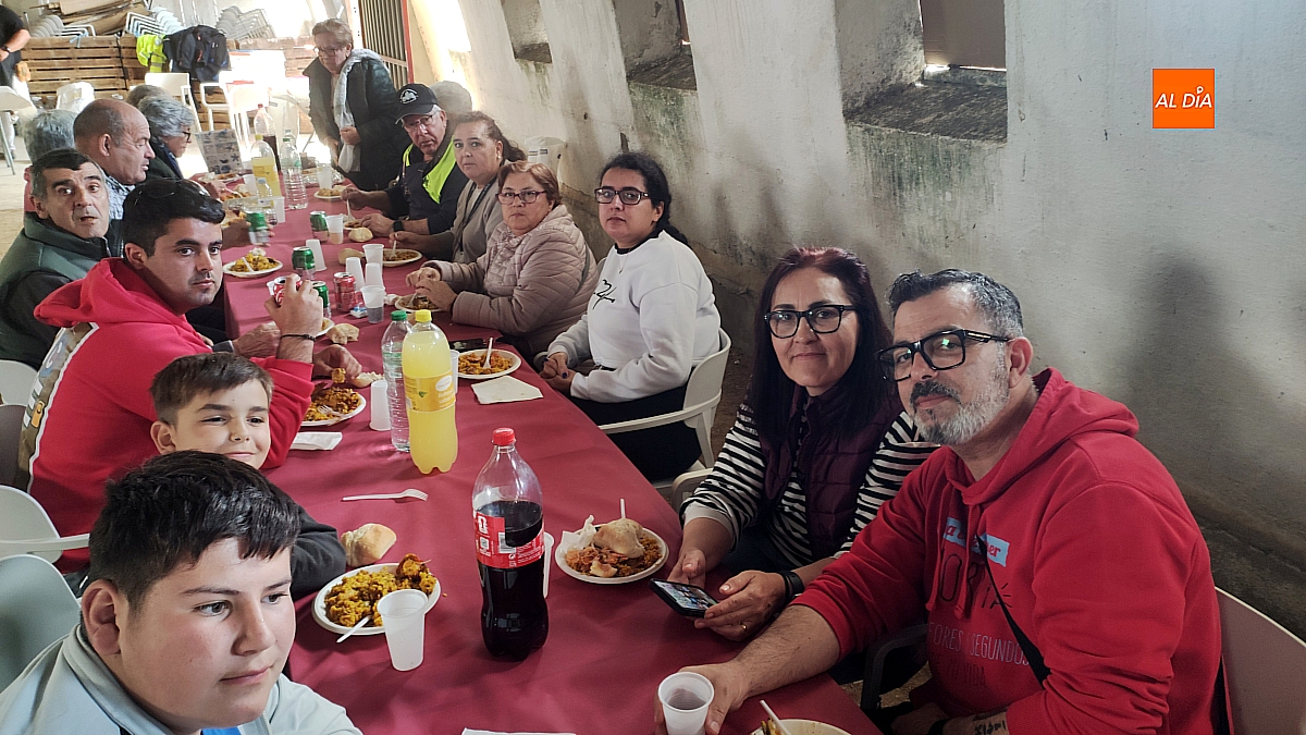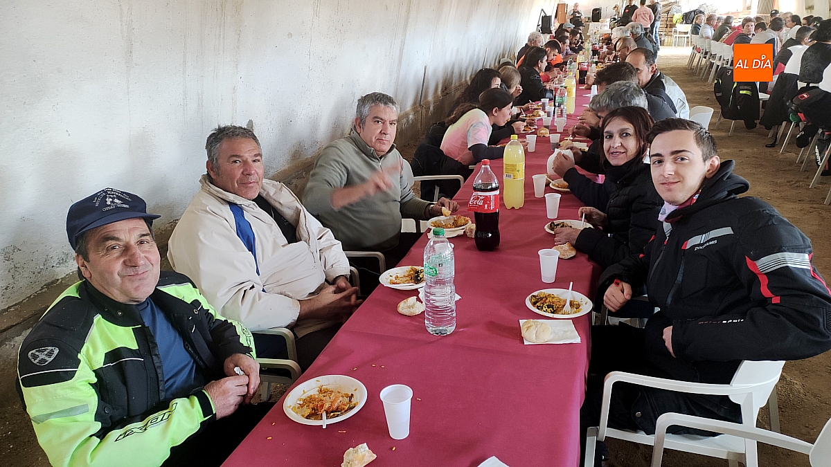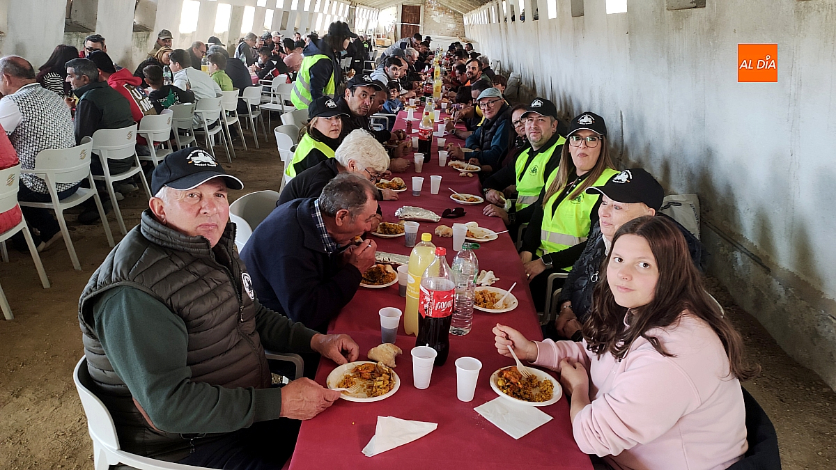 La ruta prosiguió después entre dehesas y terrenos modelados por la actividad humana, donde el verde de las encinas —salpicadas ahora de brotes y flores— componía una estampa serena, casi intemporal. De regreso a Bañobárez, el encuentro encontró su culminación en un almuerzo colectivo: una paella preparada por la empresa mirobrigense Paellas Gigantes David, servida en naves cedidas por el ayuntamiento.
