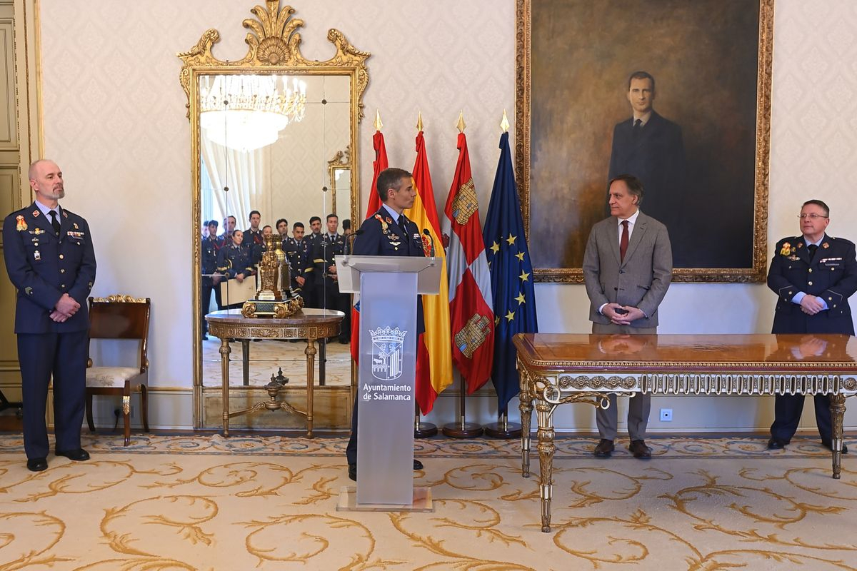El alcalde de Salamanca, Carlos García Carbayo, ha otorgado el título de Huéspedes Distinguidos a 76 alumnos de las academias del Aire formados en la Base Aérea de Matacán, destacando su disciplina y compromiso con España.