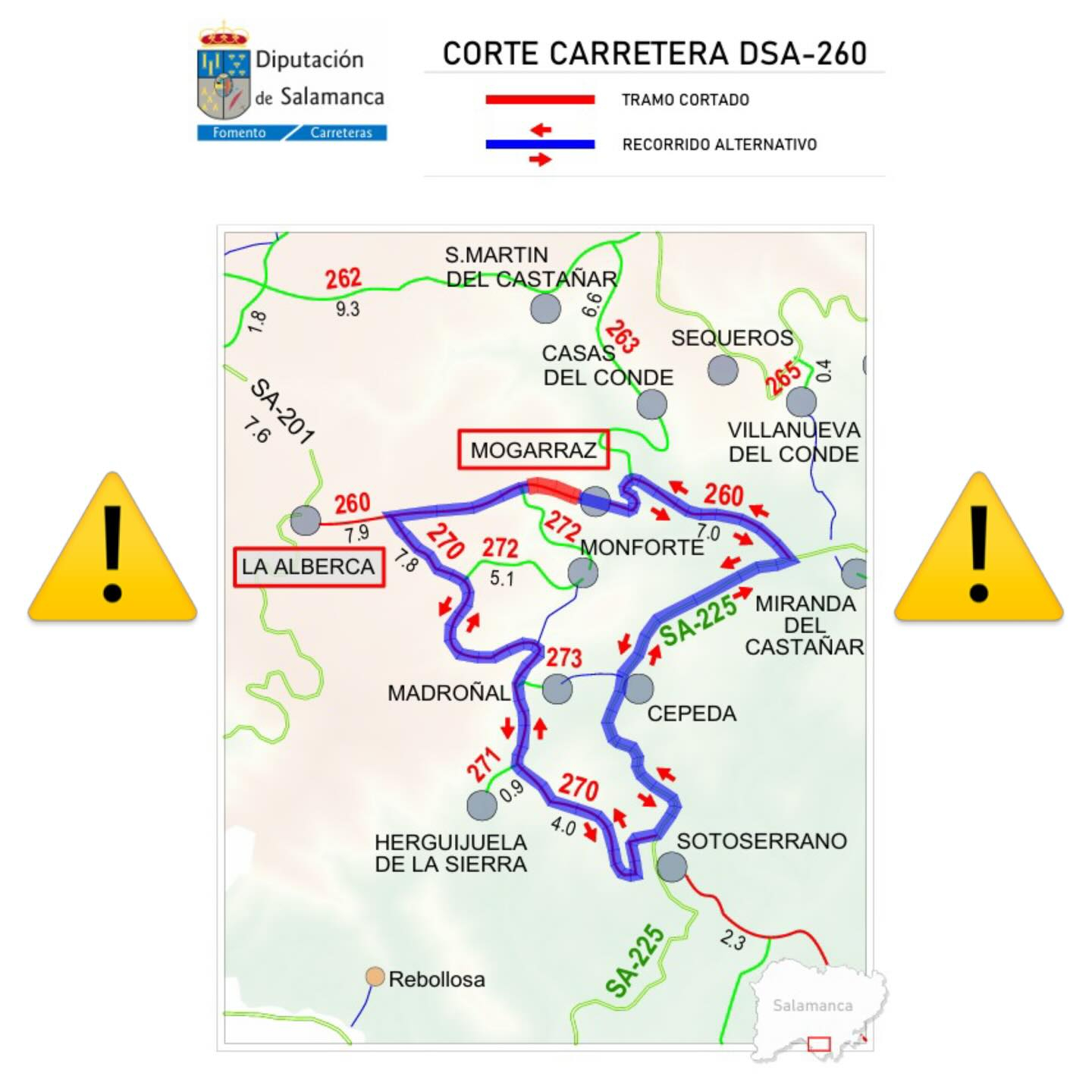 Estas rutas de desvío estarán debidamente señalizadas sobre el terreno. Se recomienda a los conductores prestar especial atención a los paneles informativos y planificar sus desplazamientos con antelación para evitar contratiempos. La Diputación ha habilitado un desvío señalizado que conecta La Alberca con Mogarraz a través de varias carreteras comarcales. El recorrido pasa por la carretera DSA-270 y DSA- 273 que desciende por los municipios Madroñal y Cepeda. Posteriormente, enlaza con la SA-225 hasta Miranda del Castañar, desde donde los conductores pueden reincorporarse a la DSA-260 por el tramo que no se ve afectado por las obras y llegar a Mogarraz.