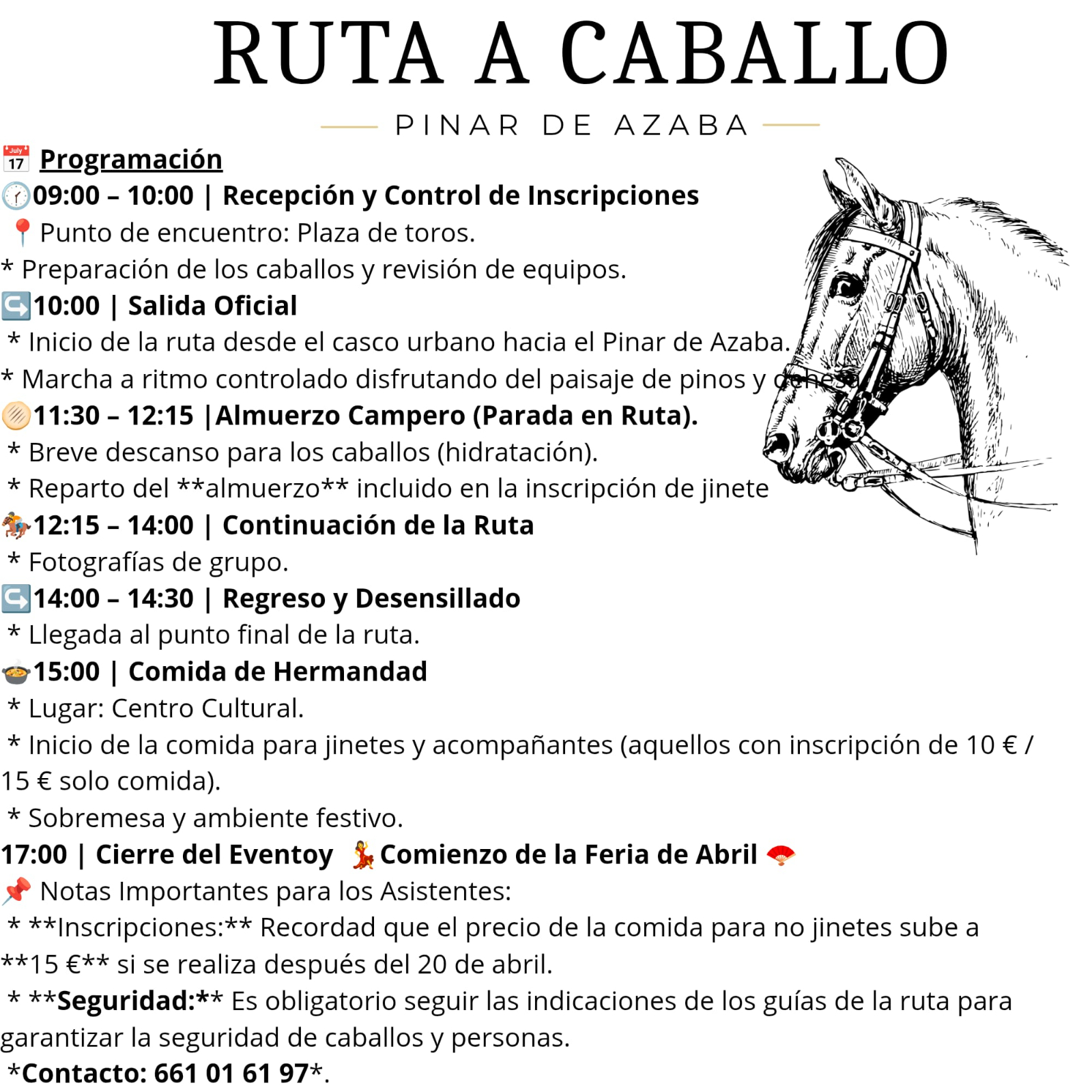 La organización ha establecido que el precio de la comida para los no jinetes es de 10 euros, tarifa que se incrementará a 15 euros si la inscripción se realiza después del 20 de abril hasta el 26 de abril. Para cualquier consulta o gestión, se ha habilitado el número de teléfono 661 01 61 97.