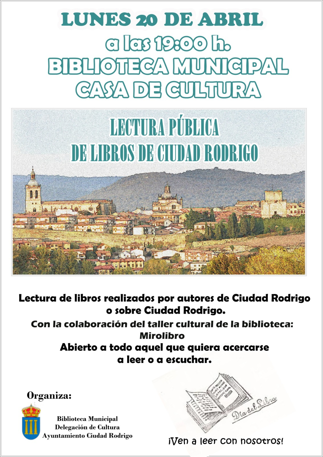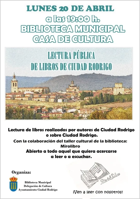 La Biblioteca Municipal de Ciudad Rodrigo organizará una lectura pública el próximo 20 de abril a las 19:00 horas para celebrar el Día del Libro. La actividad es de entrada libre y está abierta a la participación de cualquier persona como lector u oyente.