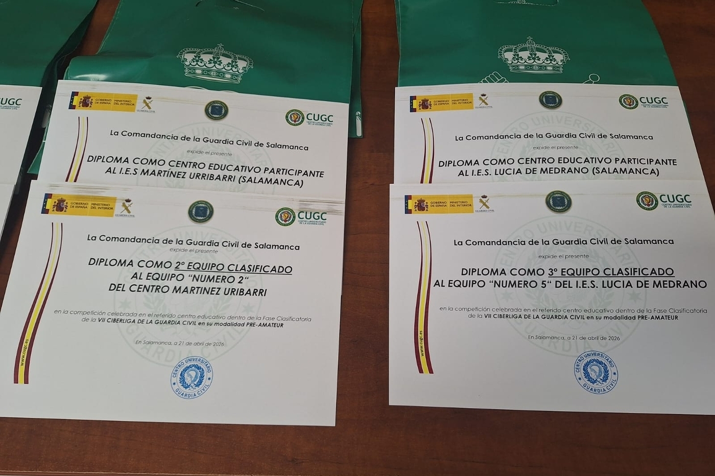 Además de los trofeos a los tres primeros clasificados, la organización ha entregado diplomas acreditativos a todos los institutos participantes para reconocer su implicación en esta iniciativa formativa impulsada por el Instituto Armado.