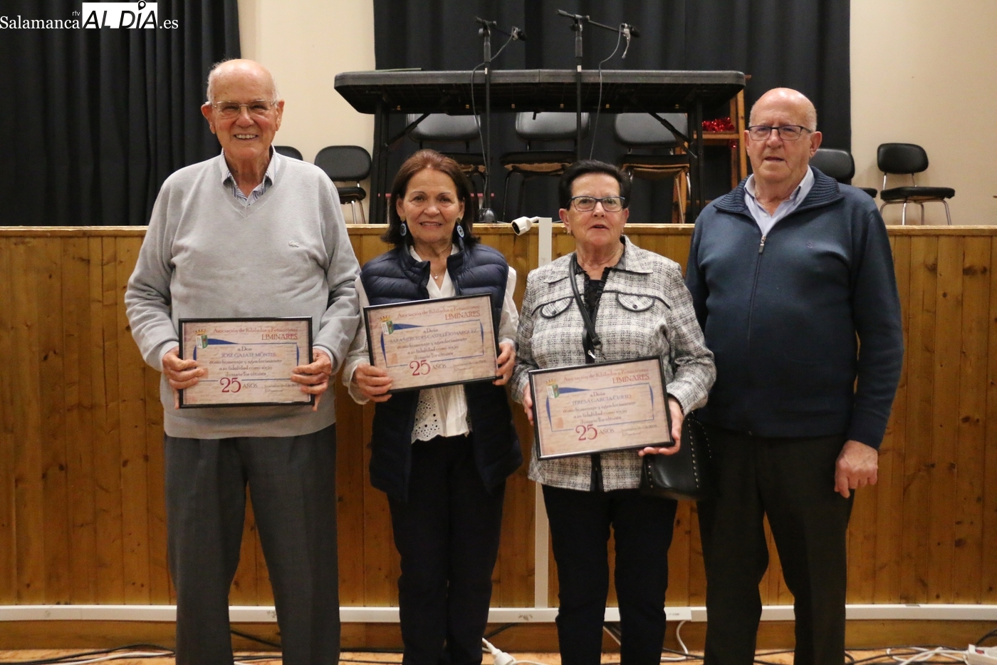 La jornada en el Centro Cultural de la Villa concluyó con un acto de homenaje a los miembros más veteranos del colectivo. La directiva procedió a la entrega de diplomas conmemorativos a las personas que este año han cumplido 25 años como socios de la entidad, un reconocimiento que recayó en Teresa García Curto, Sara Mercedes Castillejo Márquez y José Gajate Montes.