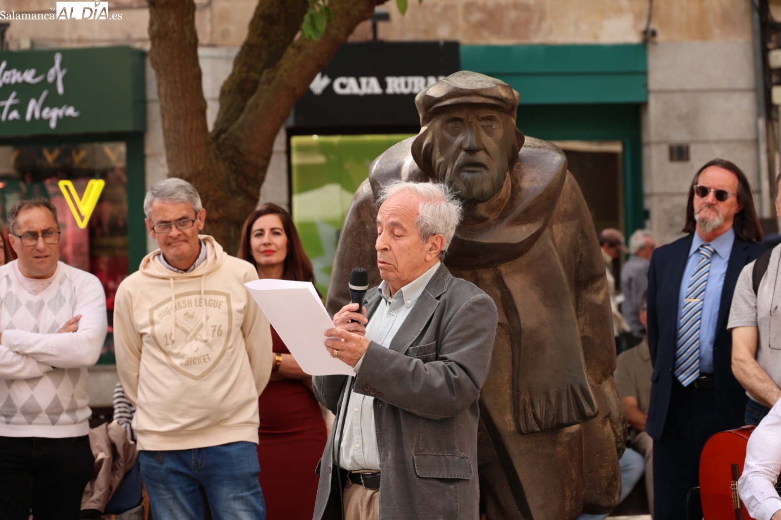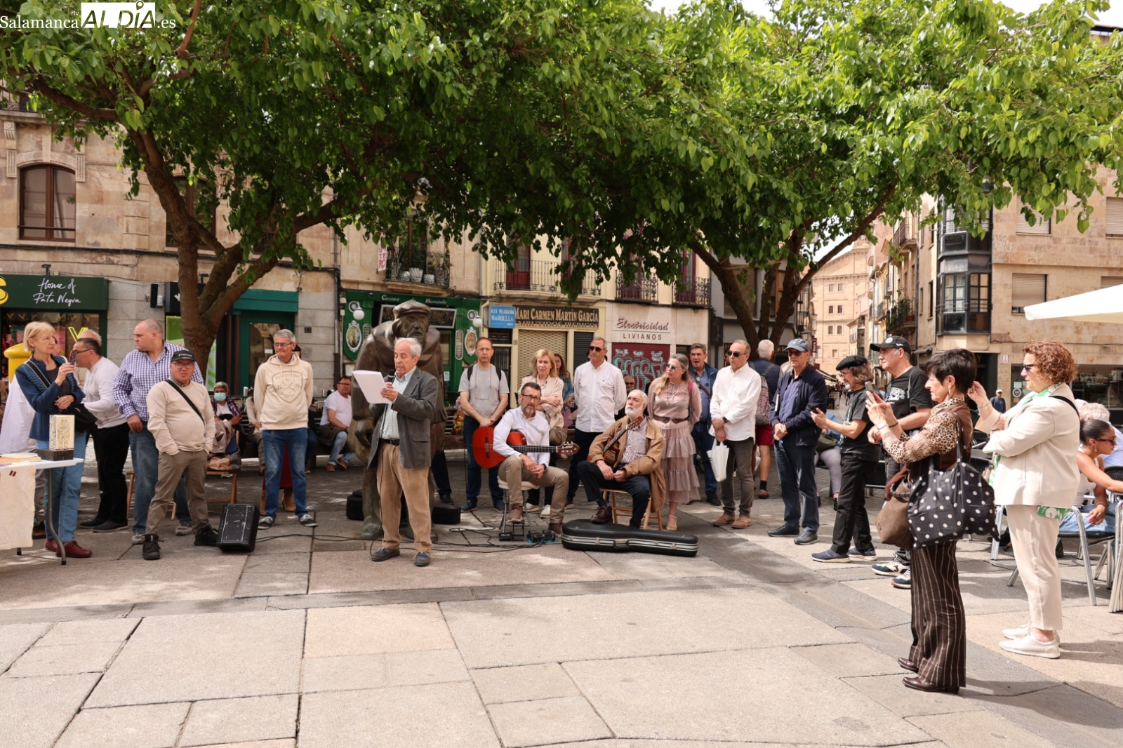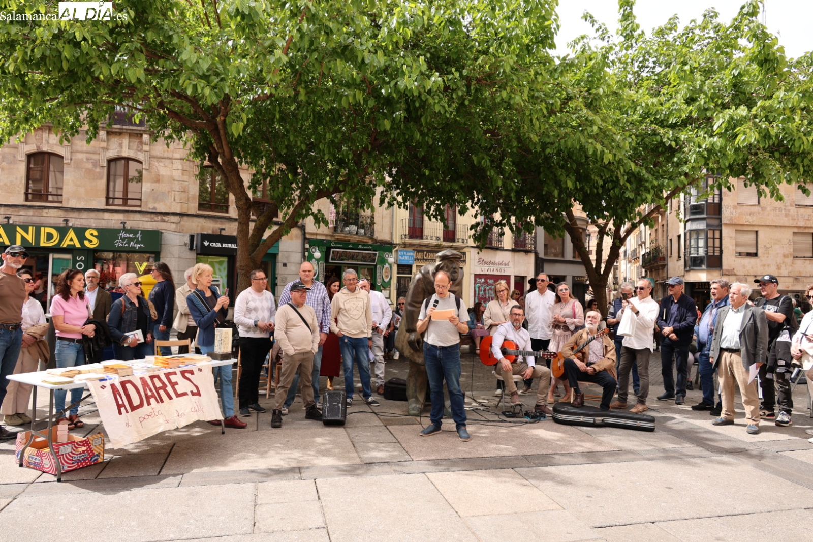La plaza del Corrillo de Salamanca ha sido el escenario de un emotivo homenaje a Remigio "Adares" y Agustín Casillas con motivo del Día del Libro. El acto cultural ha contado con un micrófono abierto que ha permitido a poetas y aficionados compartir sus versos y música en pleno casco histórico.