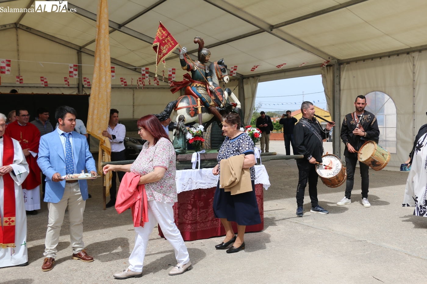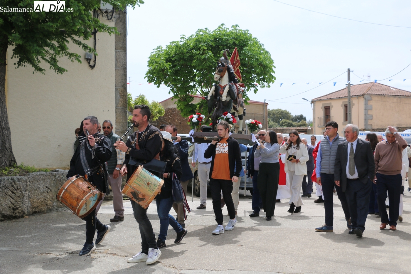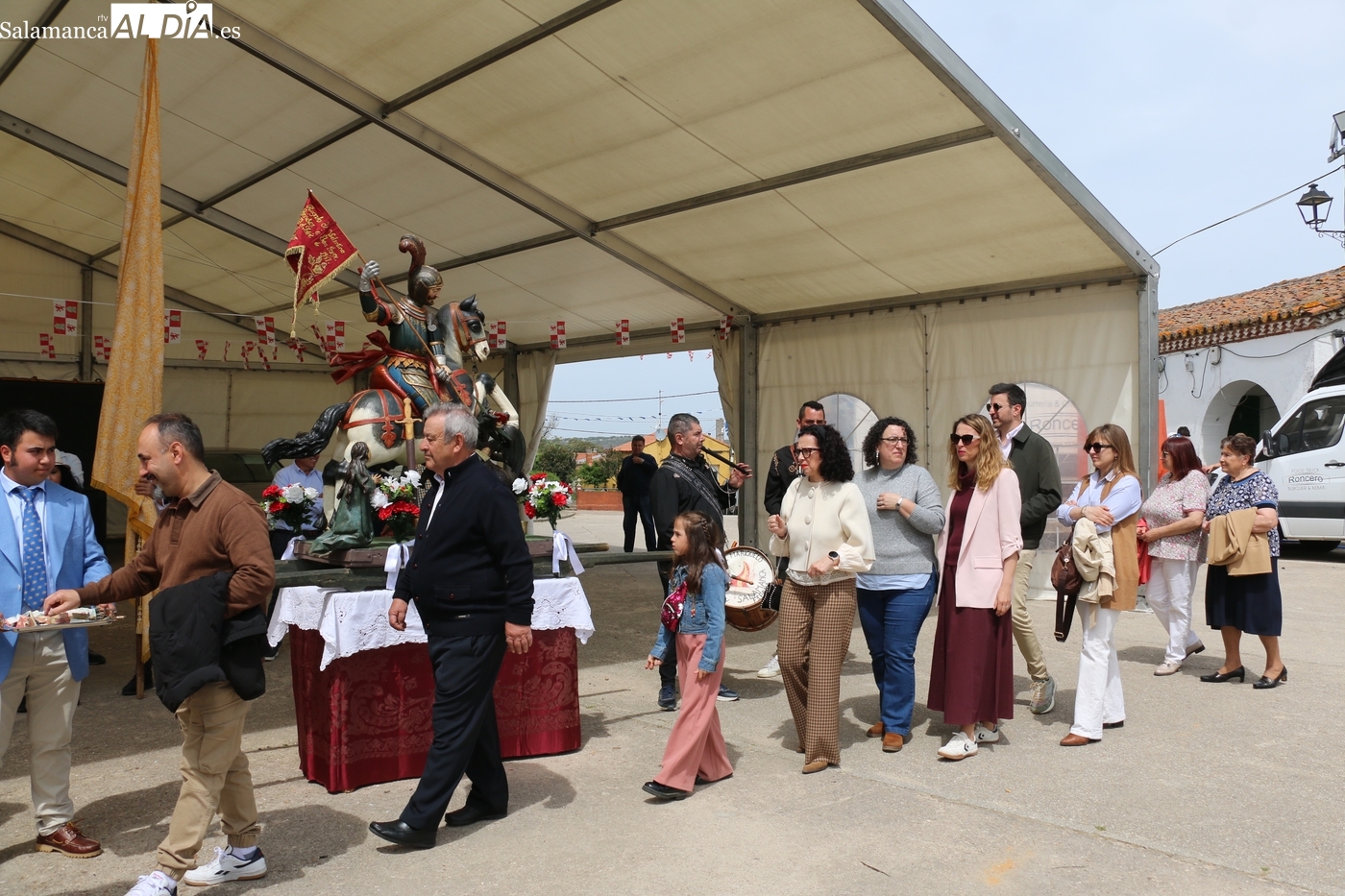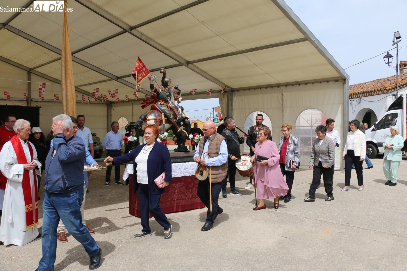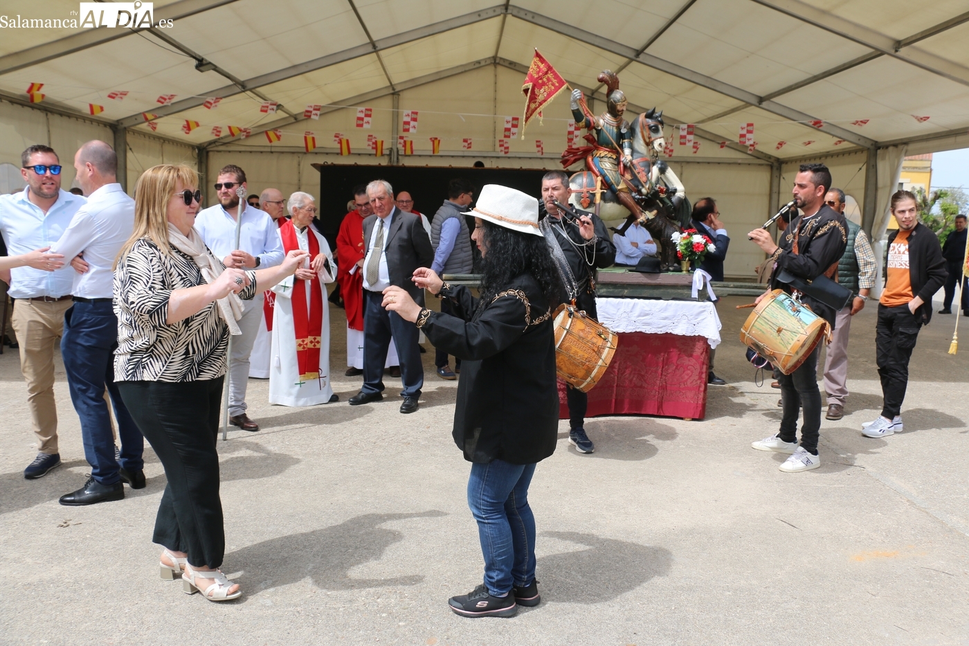 Durante este jueves, 23 de abril, día grande de las fiestas, los vecinos han participado pasado el mediodía en la eucaristía en honor al Patrón. El acto religioso ha estado cooficiado por los sacerdotes del Arciprestazgo del Abadengo y amenizado por los sones de Ángel Rufino, 'El Mariquelo', quien en esta ocasión ha estado acompañado por Álvaro, 'El mozo de Linares'.