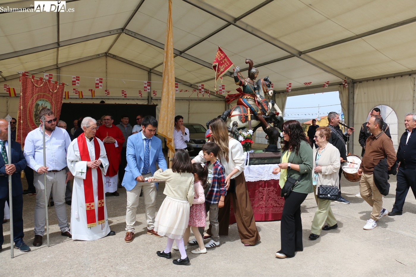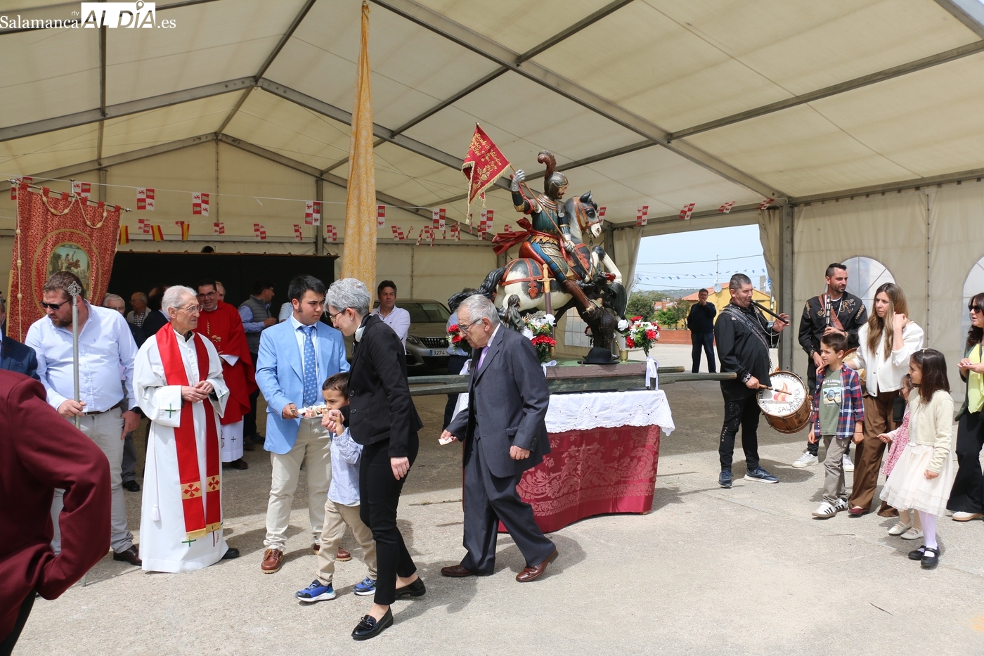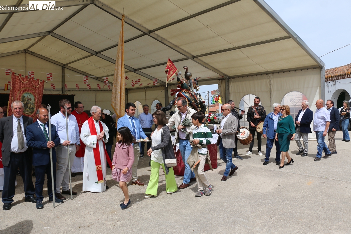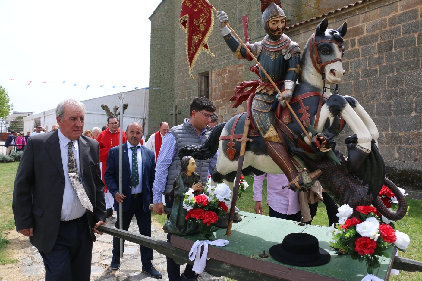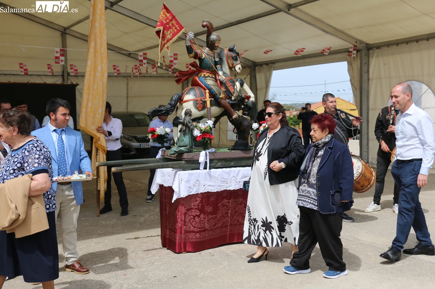 Durante este jueves, 23 de abril, día grande de las fiestas, los vecinos han participado pasado el mediodía en la eucaristía en honor al Patrón. El acto religioso ha estado cooficiado por los sacerdotes del Arciprestazgo del Abadengo y amenizado por los sones de Ángel Rufino, 'El Mariquelo', quien en esta ocasión ha estado acompañado por Álvaro, 'El mozo de Linares'.