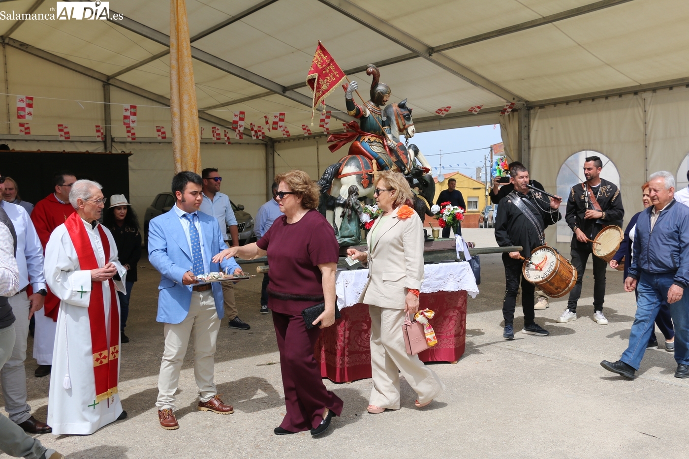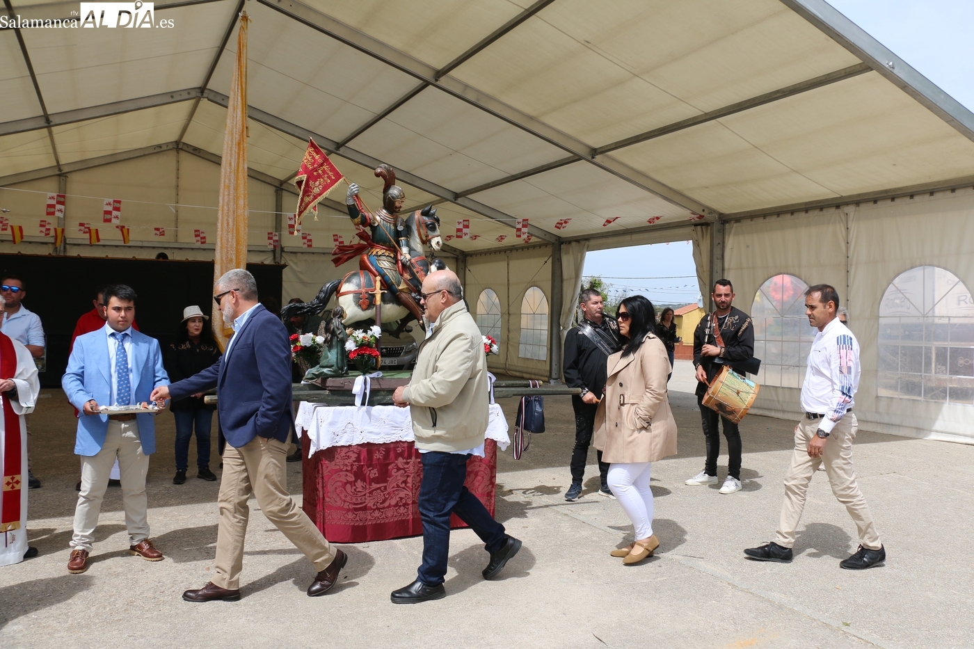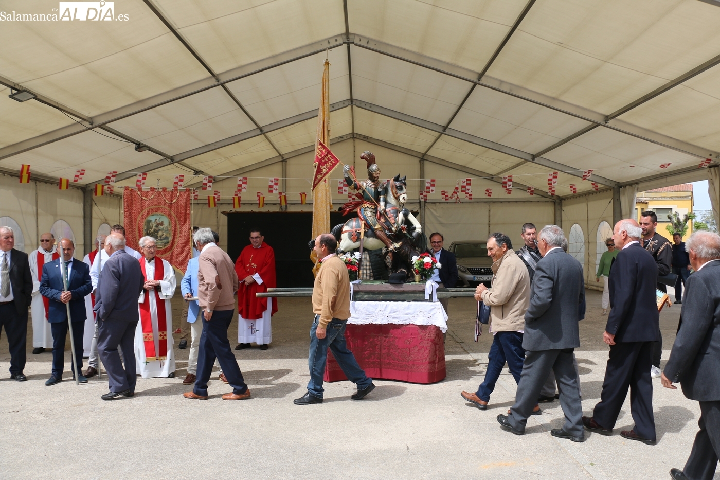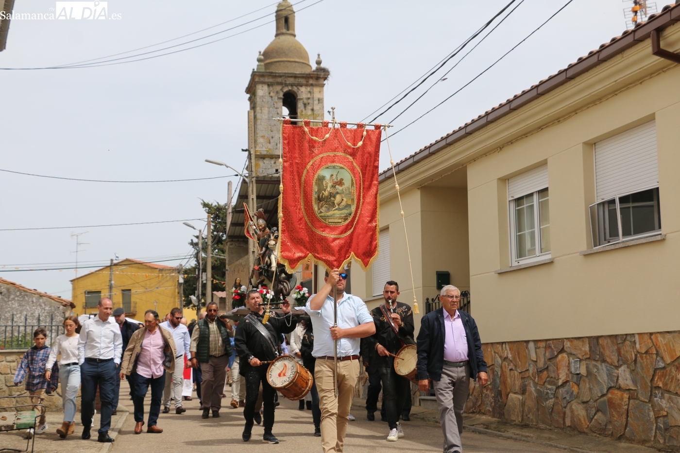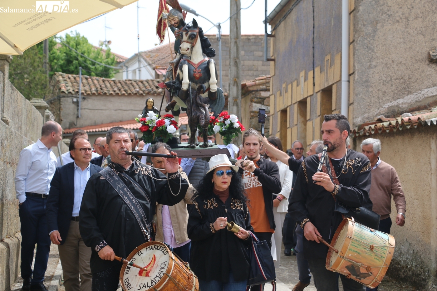Durante este jueves, 23 de abril, día grande de las fiestas, los vecinos han participado pasado el mediodía en la eucaristía en honor al Patrón. El acto religioso ha estado cooficiado por los sacerdotes del Arciprestazgo del Abadengo y amenizado por los sones de Ángel Rufino, 'El Mariquelo', quien en esta ocasión ha estado acompañado por Álvaro, 'El mozo de Linares'.