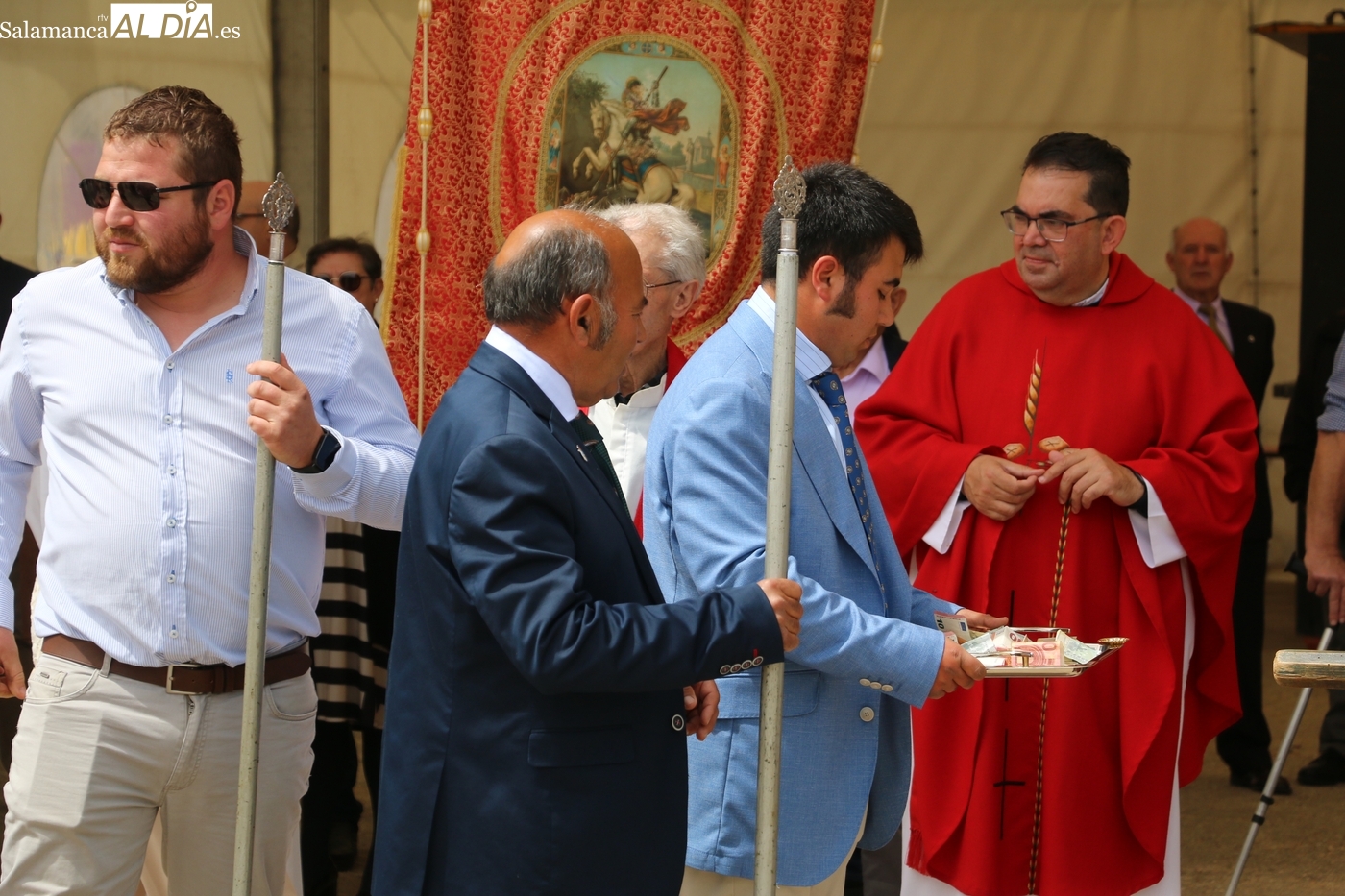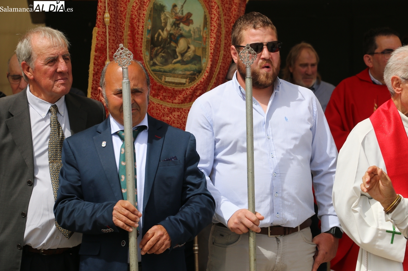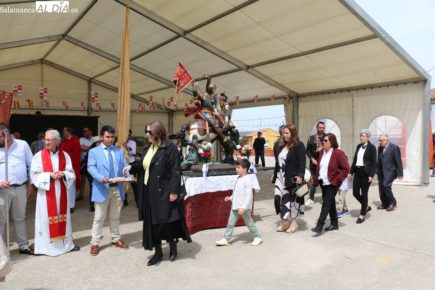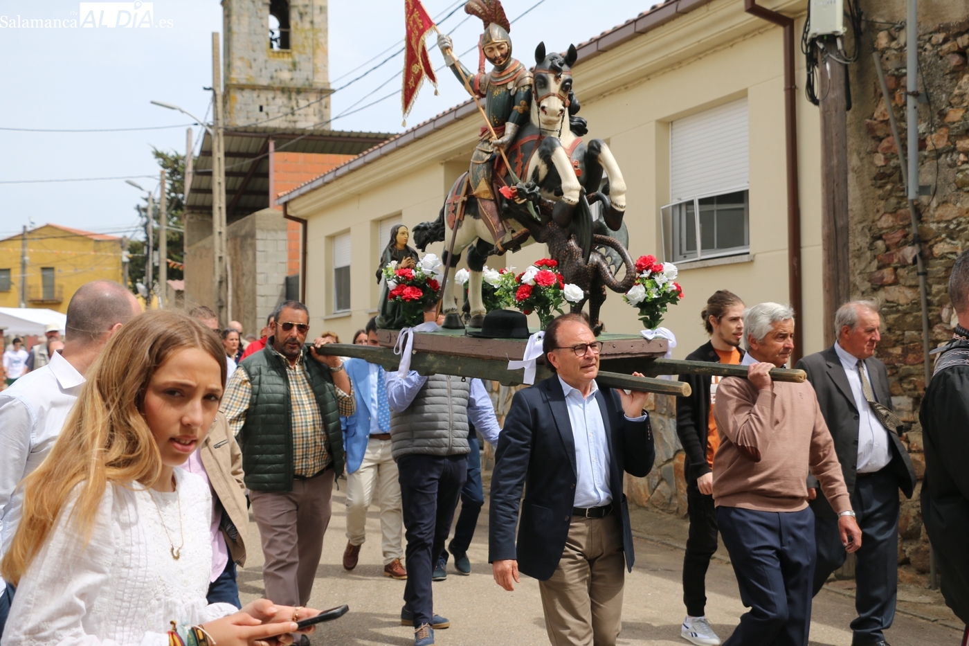 Tras la misa, la imagen del cazador de dragones ha salido en procesión a hombros de los vecinos. El recorrido ha estado escoltado por el alcalde de la localidad, Jesús Martín, y el teniente de alcalde, Daniel Arroyo, que, varas en mano, han ejercido como mayordomos de San Jorge. Finalizada la procesión por las calles de costumbre, y a la que asistió un buen número de alcaldes y concejales de la comarca, se ha procedido al tradicional ofertorio antes del regreso del Patrón a la iglesia.