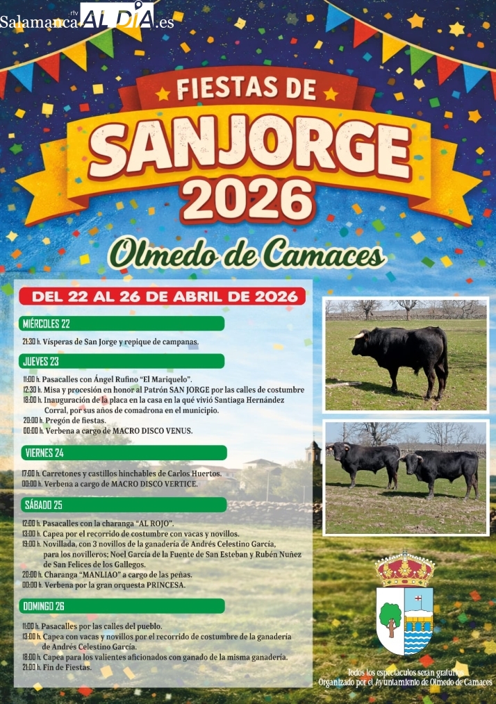 Los vecinos de Olmedo de Camaces celebran ya sus fiestas patronales en honor a San Jorge, unas celebraciones que comenzaron la pasada noche con el repique de campanas y que se extenderán hasta el próximo domingo, 26 de abril, con un programa que incluye verbenas y espectáculos taurinos.
