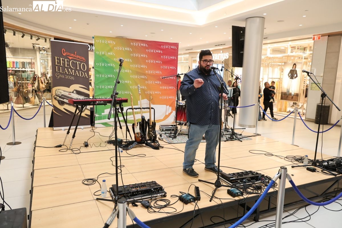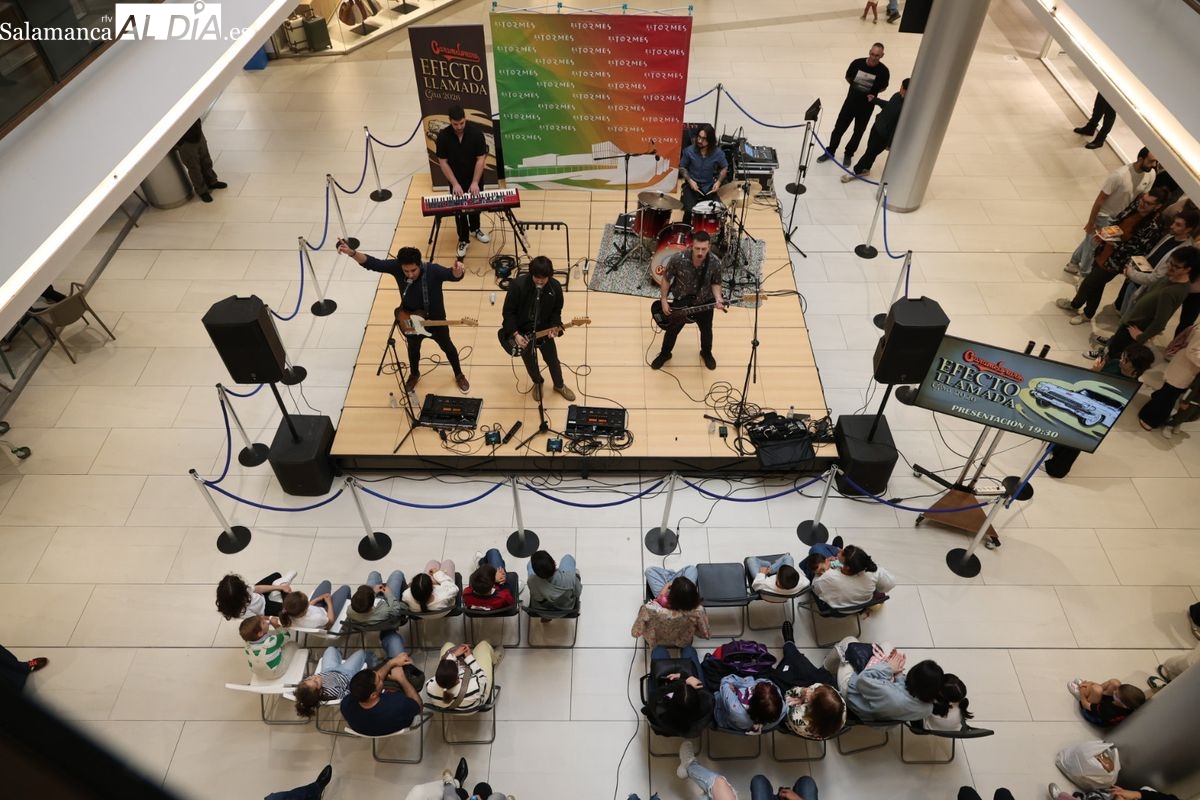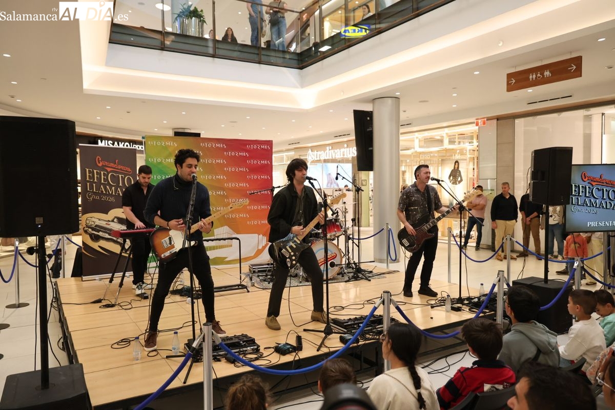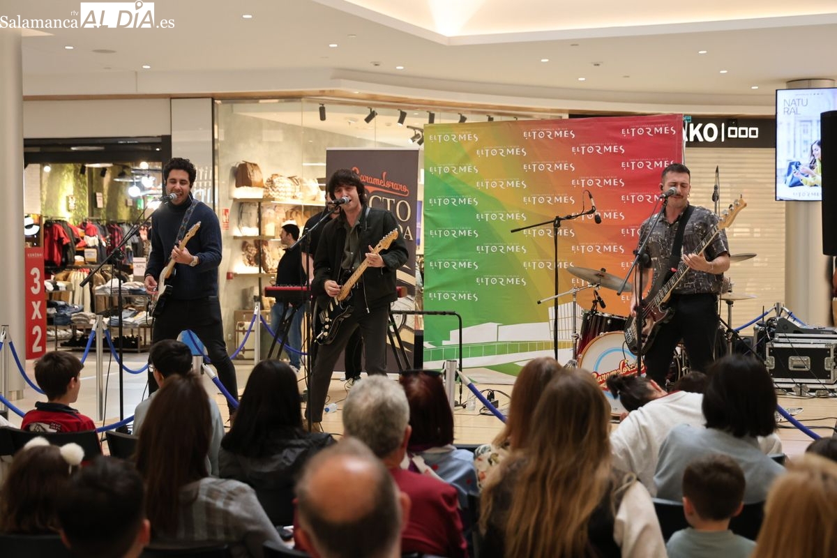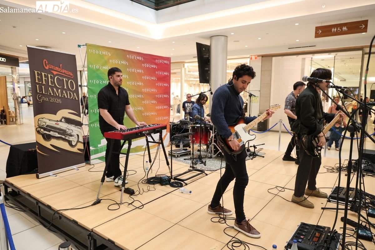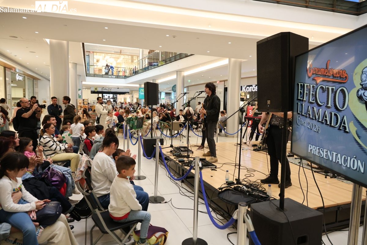 El Centro Comercial El Tormes ha acogido este viernes, 24 de abril, la presentación oficial de la gira nacional 'Efecto Llamada' del grupo salmantino Carameloraro. El evento ha combinado música en directo con proyecciones audiovisuales.
