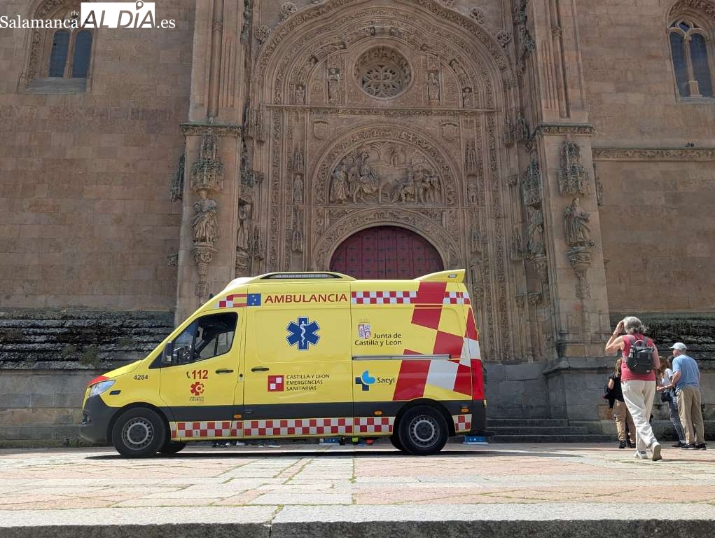 Una visitante extranjera sufre un mareo repentino en los accesos a la Catedral Nueva este martes. Efectivos sanitarios y agentes municipales se han desplazado hasta el céntrico enclave salmantino para atender a la mujer, que ha permanecido consciente en todo momento