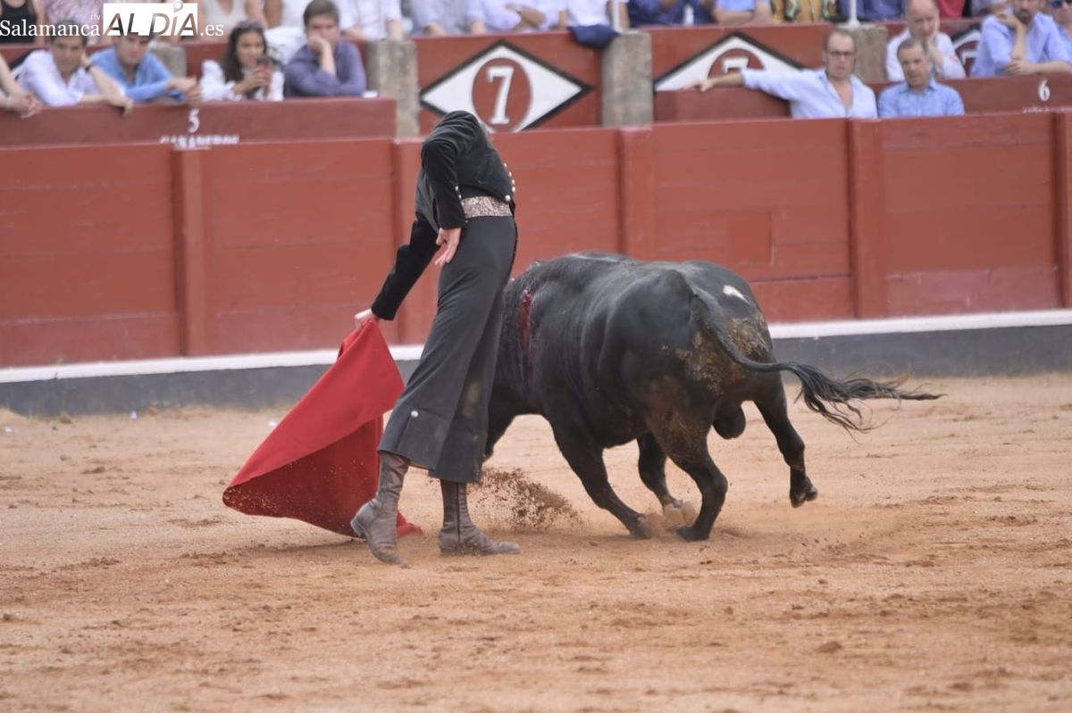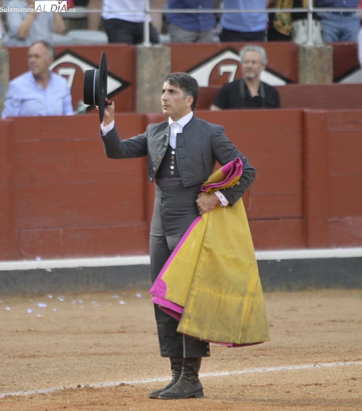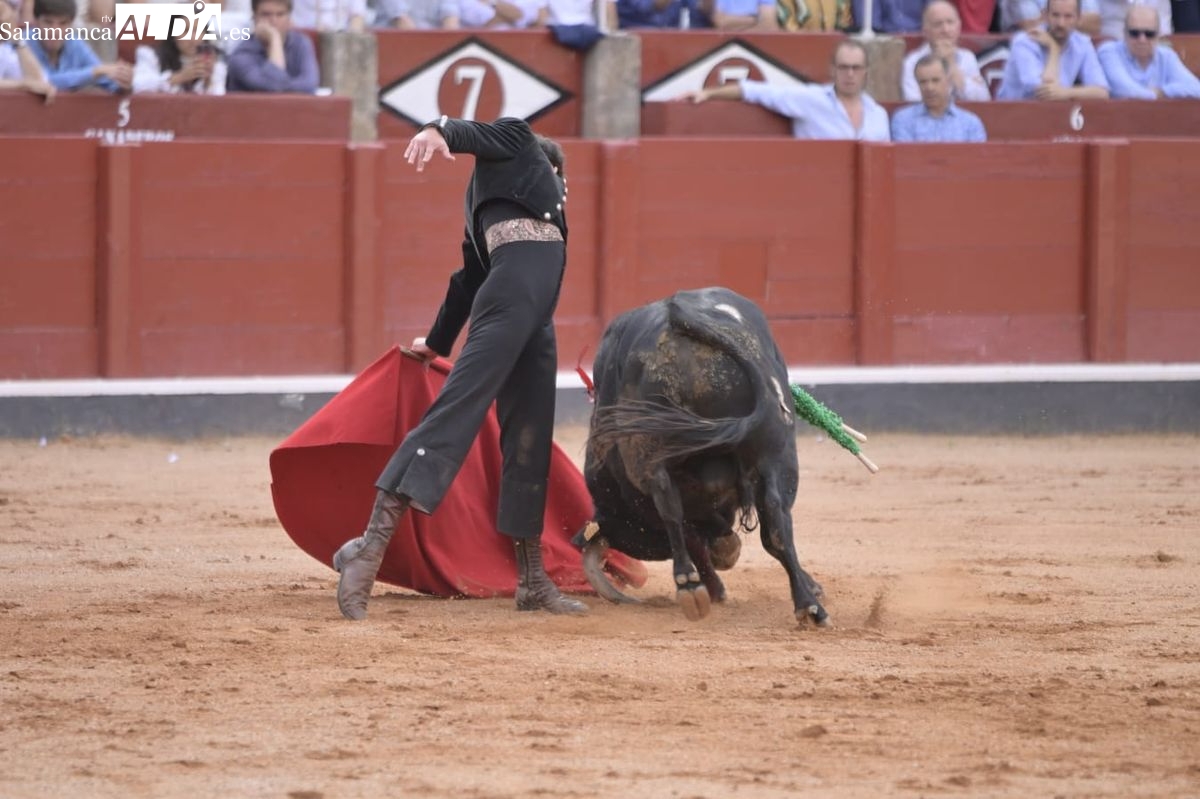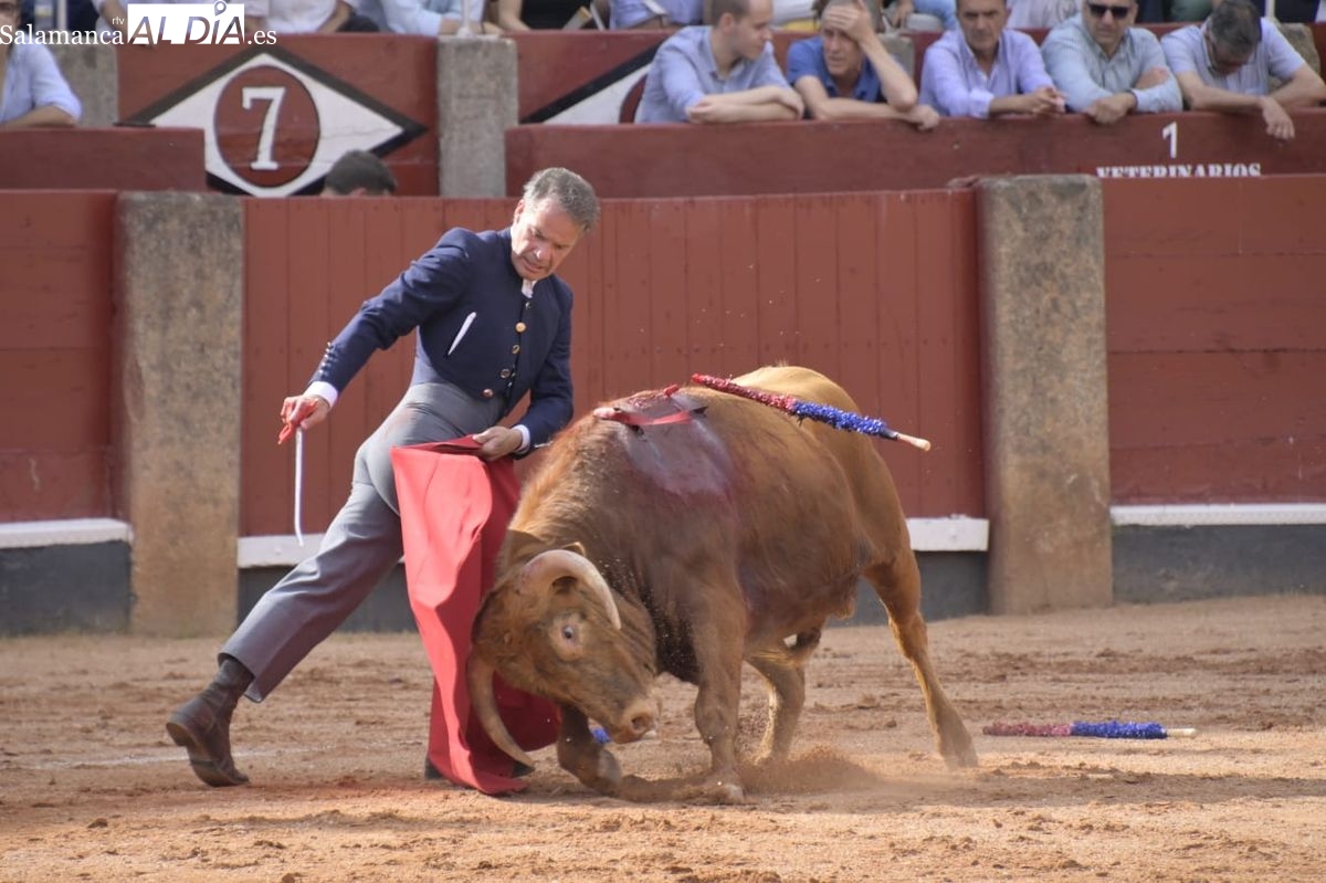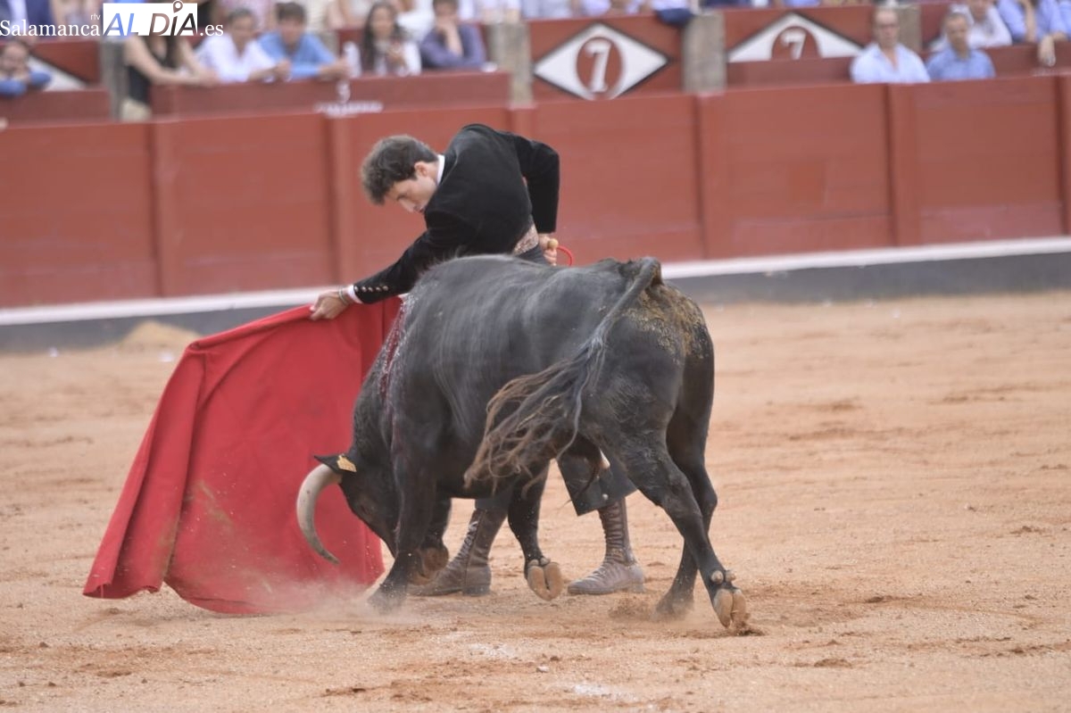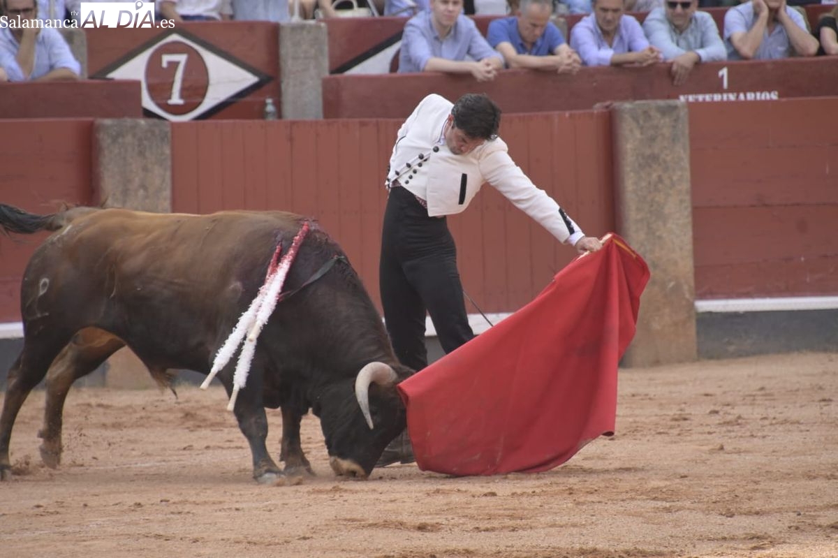La actuación de más ecode la tarde fue la de Manuel Diosleguarde, que cortó las dos orejas al quinto de la tarde tras una faena de absoluta entrega rubricada con un espadazo soberbio volcándose en el morrillo, saliendo prendido de forma dramática y dejando atrás los fantasmas que habitaban en su cabeza después de la terrible cornada que sufrió en Cuéllar hace casi tres años. Después de aquel fatídico percance se le habían escapado varios triunfos a Diosleguarde por la vía de la espada. No se lo podía dejar marchar en Salamanca y ejecutó la suerte con una verdad absoluta.