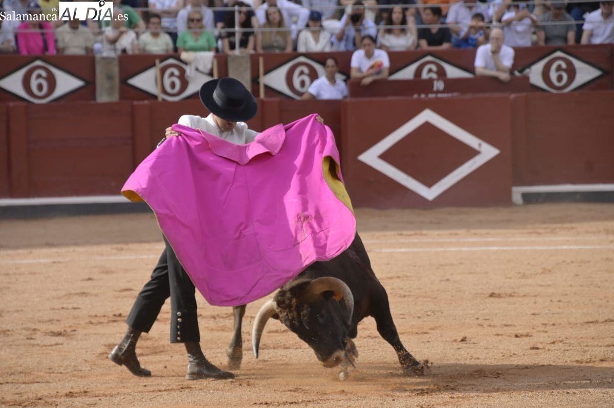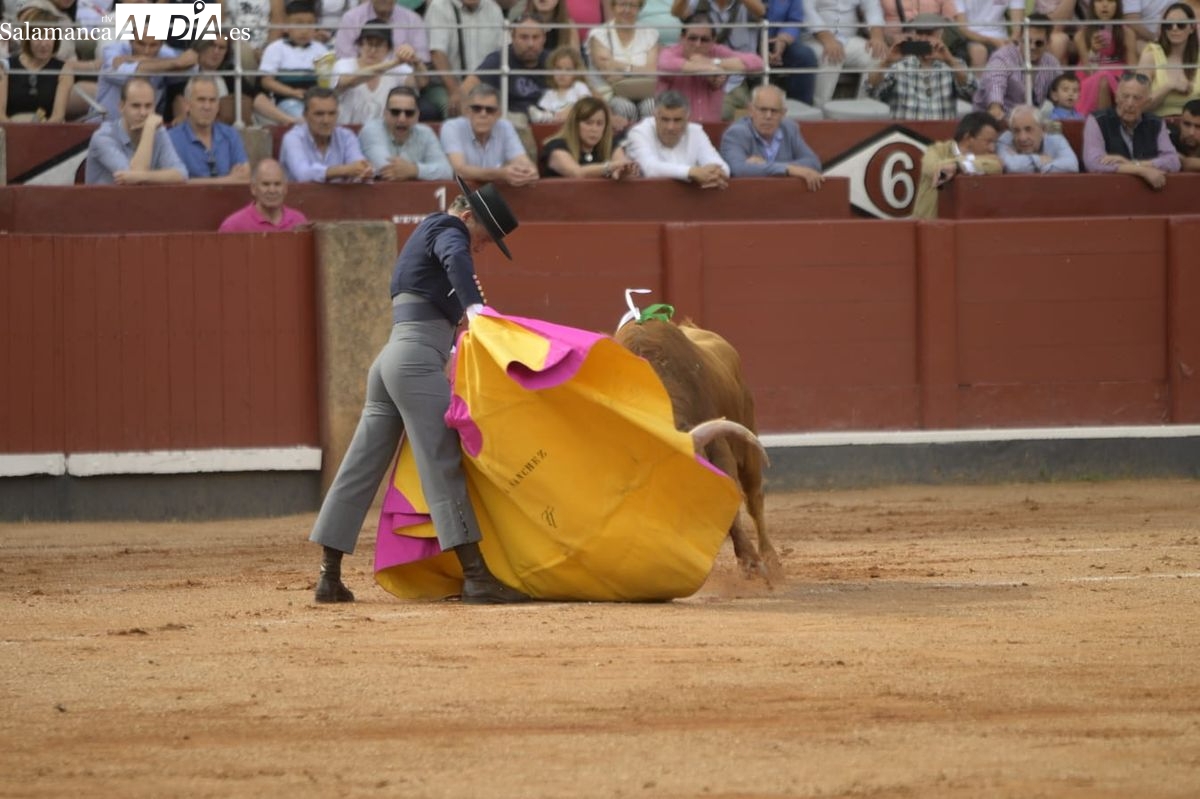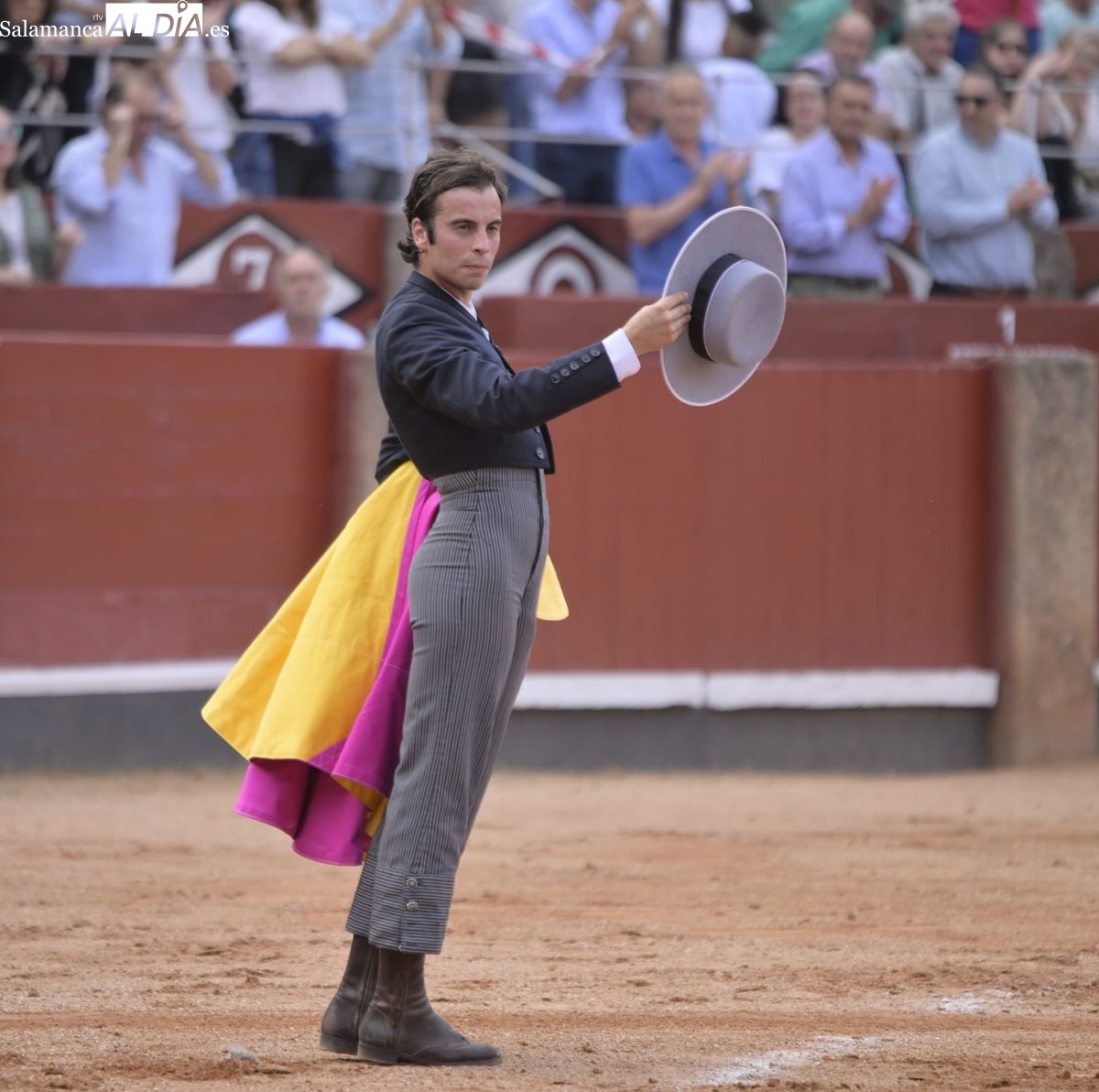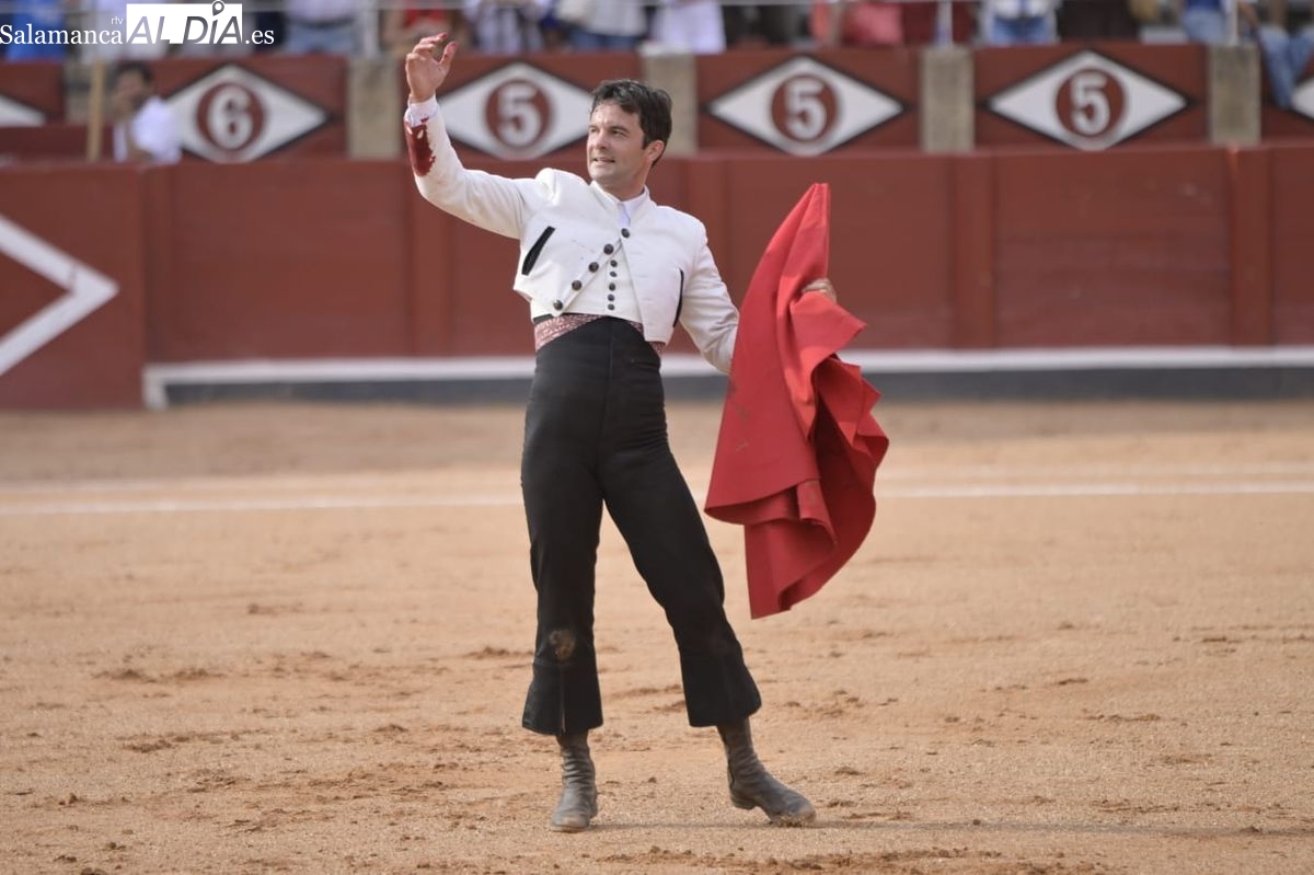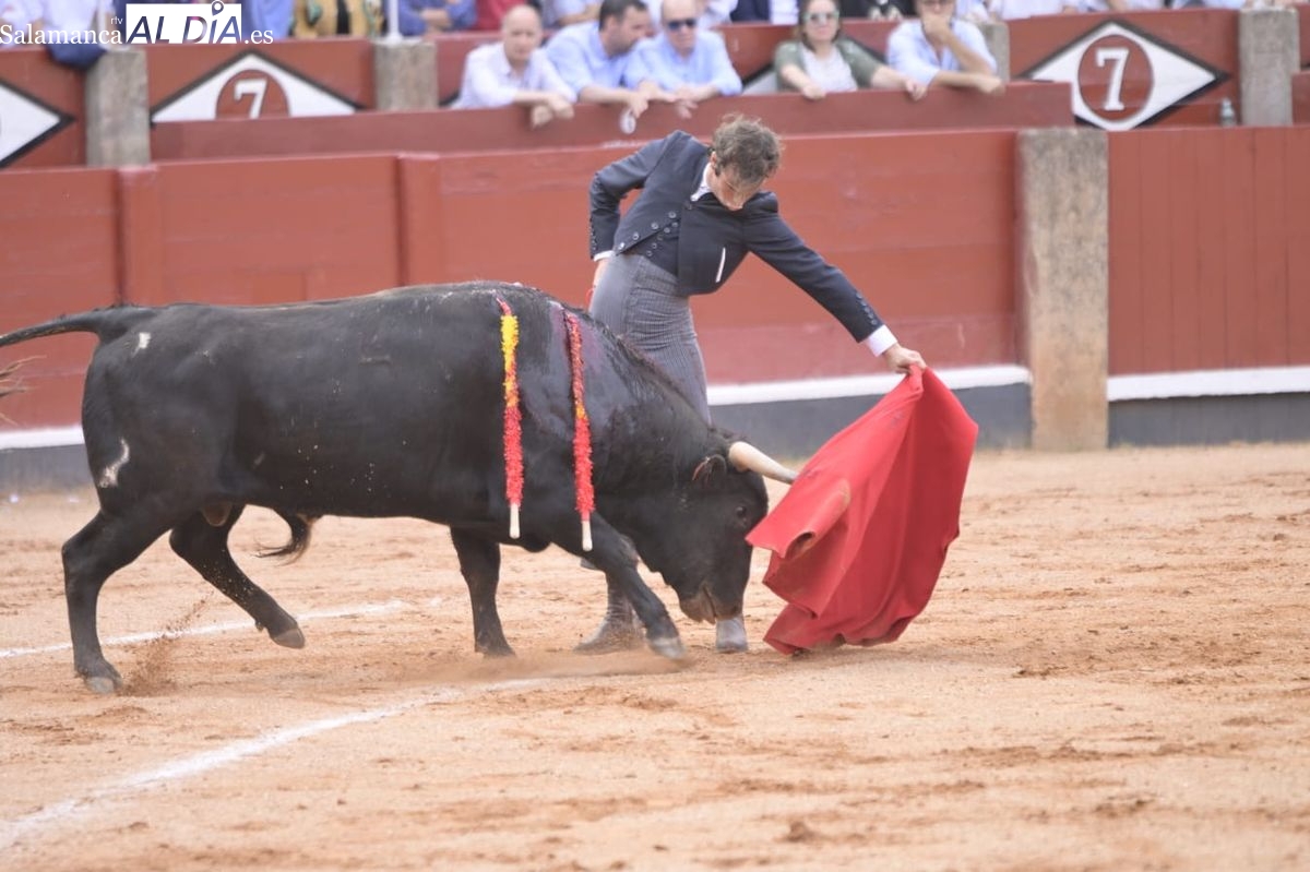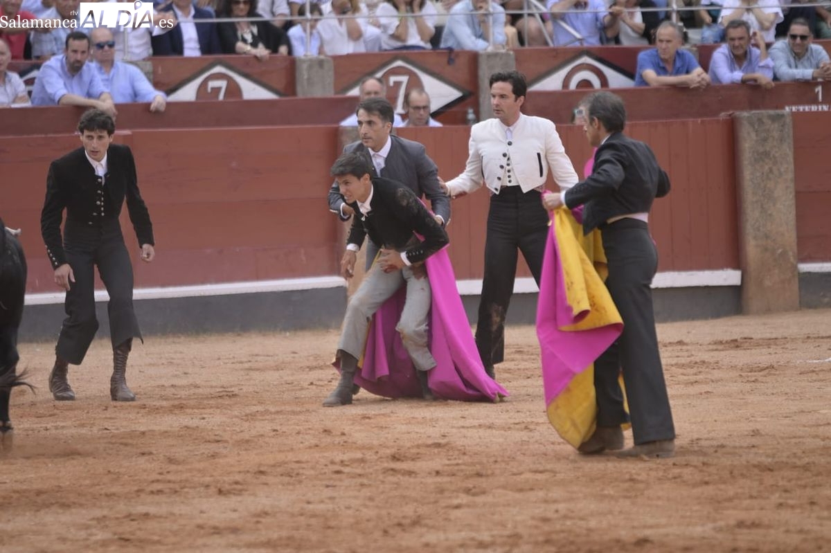 La actuación de más ecode la tarde fue la de Manuel Diosleguarde, que cortó las dos orejas al quinto de la tarde tras una faena de absoluta entrega rubricada con un espadazo soberbio volcándose en el morrillo, saliendo prendido de forma dramática y dejando atrás los fantasmas que habitaban en su cabeza después de la terrible cornada que sufrió en Cuéllar hace casi tres años. Después de aquel fatídico percance se le habían escapado varios triunfos a Diosleguarde por la vía de la espada. No se lo podía dejar marchar en Salamanca y ejecutó la suerte con una verdad absoluta.