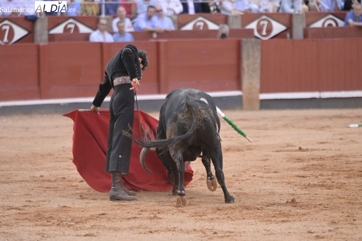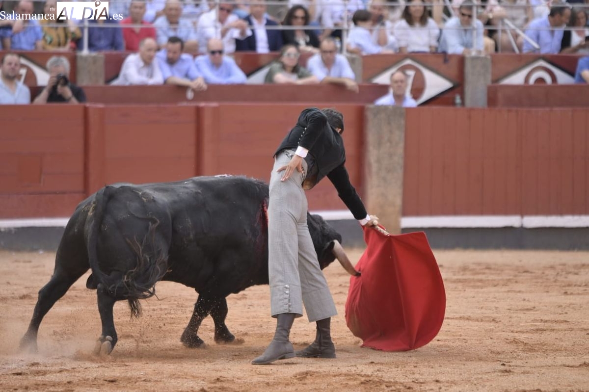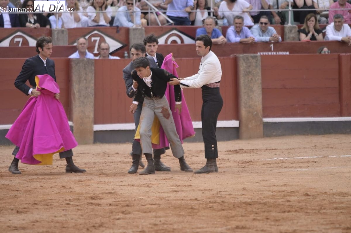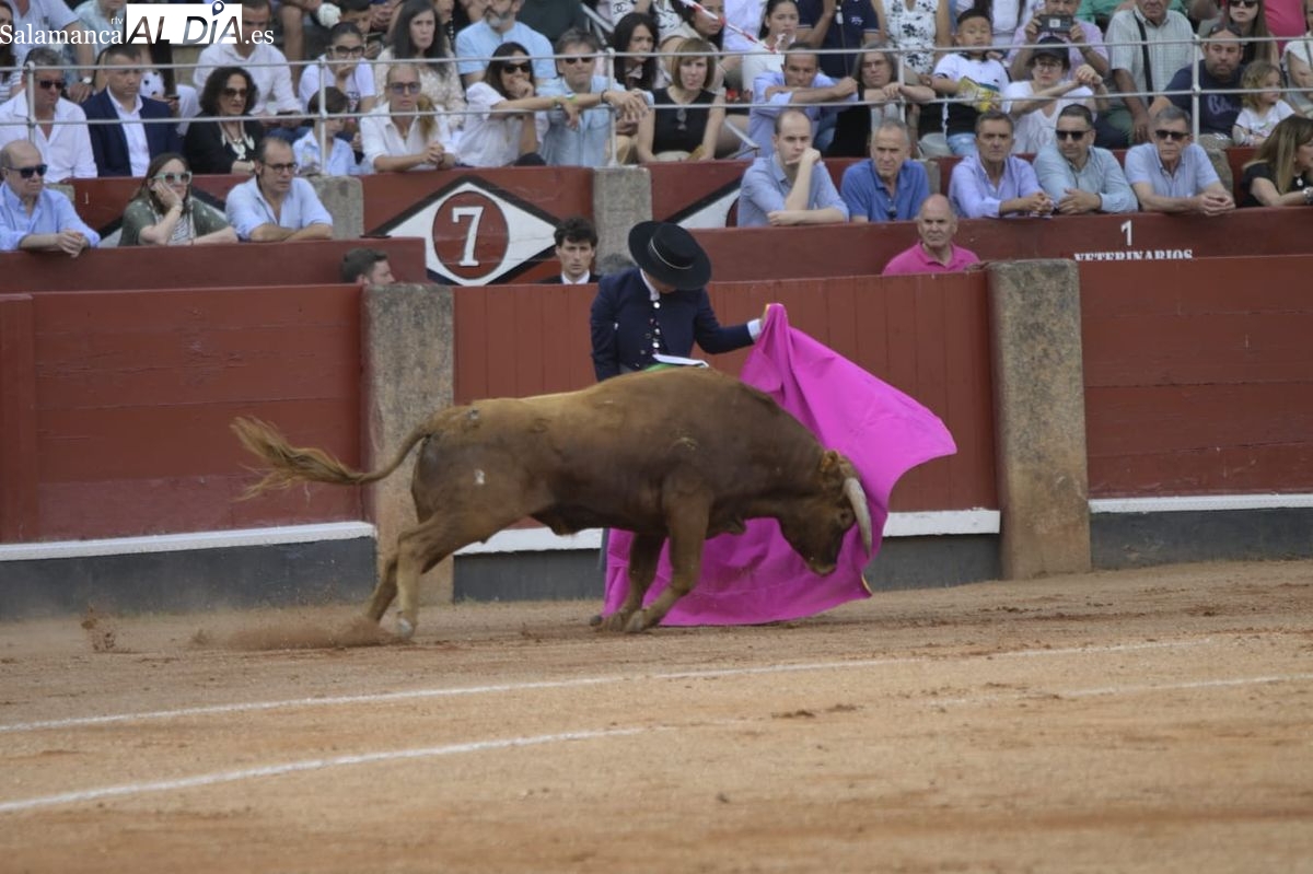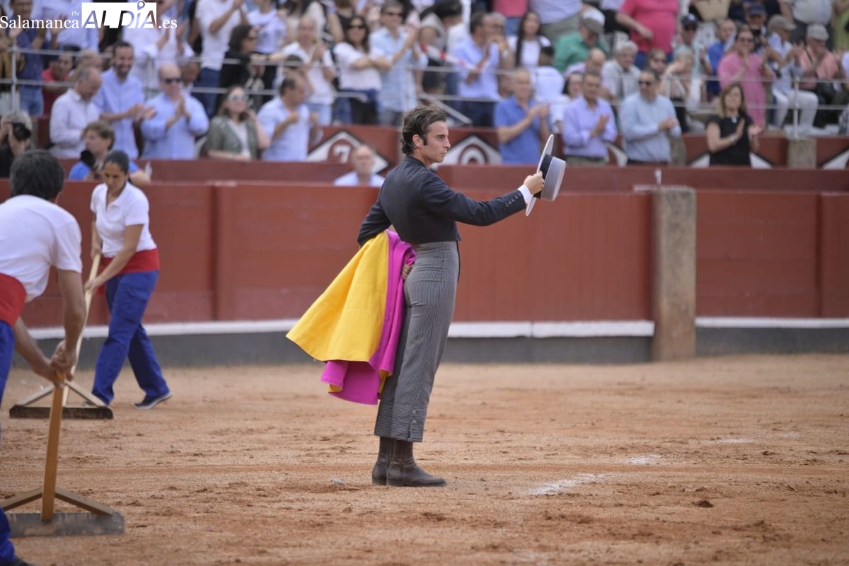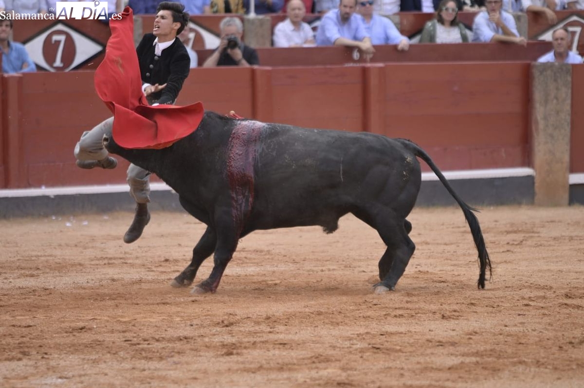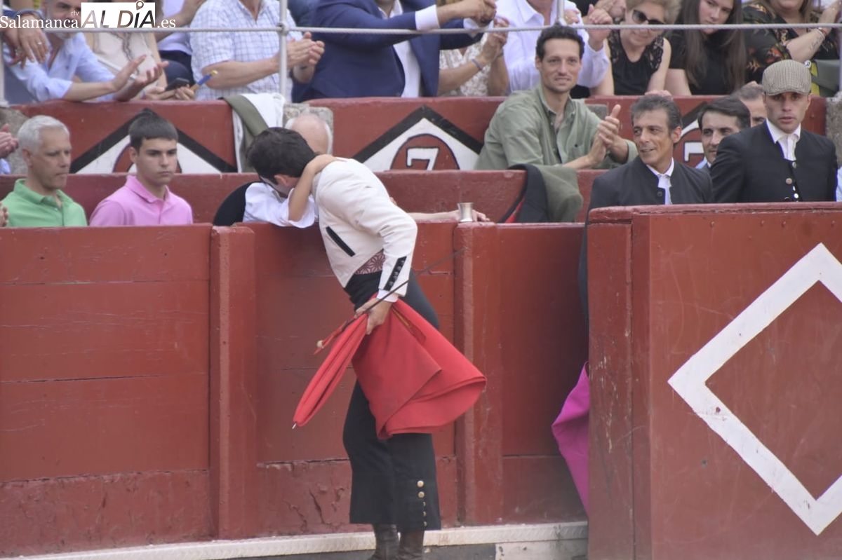La actuación de más ecode la tarde fue la de Manuel Diosleguarde, que cortó las dos orejas al quinto de la tarde tras una faena de absoluta entrega rubricada con un espadazo soberbio volcándose en el morrillo, saliendo prendido de forma dramática y dejando atrás los fantasmas que habitaban en su cabeza después de la terrible cornada que sufrió en Cuéllar hace casi tres años. Después de aquel fatídico percance se le habían escapado varios triunfos a Diosleguarde por la vía de la espada. No se lo podía dejar marchar en Salamanca y ejecutó la suerte con una verdad absoluta.